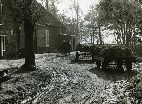 Foto in zwart-wit van een boerenerf met geladen wage...