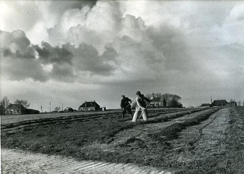 Foto in zwart-wit van twee vrouwen die hooi schudden...