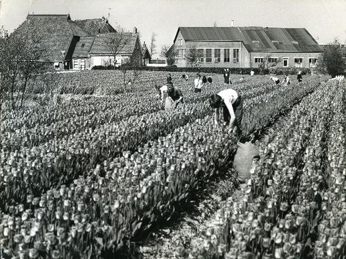 Foto in zwart-wit van het koppen van tulpen bij Beet...