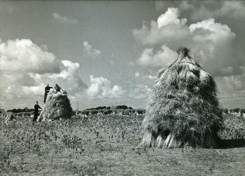 Foto in zwart-wit van schelven vlas door J.D. de Jong