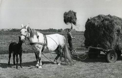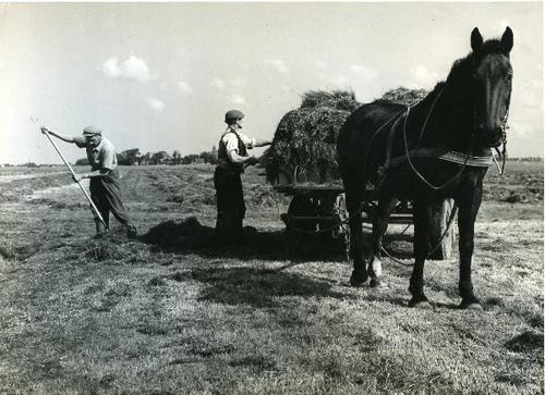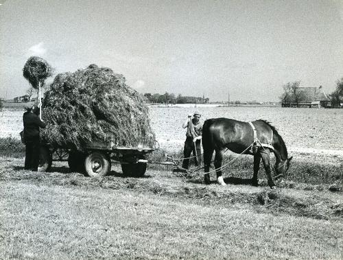 Foto in zwart-wit van het handmatig opladen van hooi...