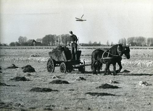 Foto in zwart-wit van het uitrijden van mest vanuit ...