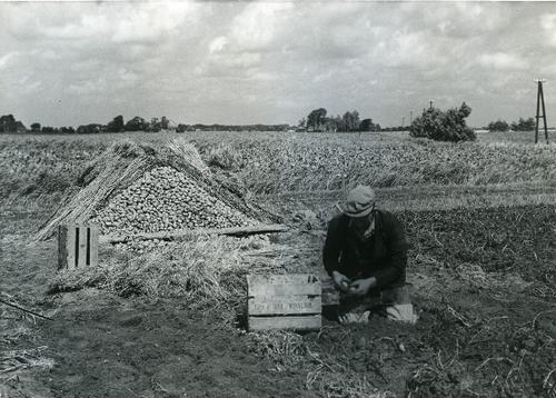 Foto van het handmatig rapen van aardappelen vlak bi...