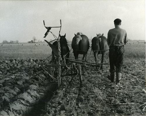 Foto in zwart-wit van een wentelploeg met een paard ...