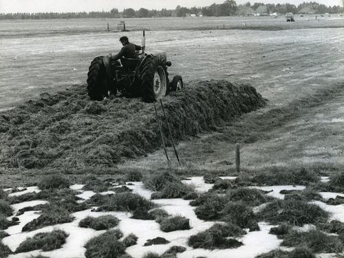Foto in zwart-wit van het opladen van kuilgras op ee...