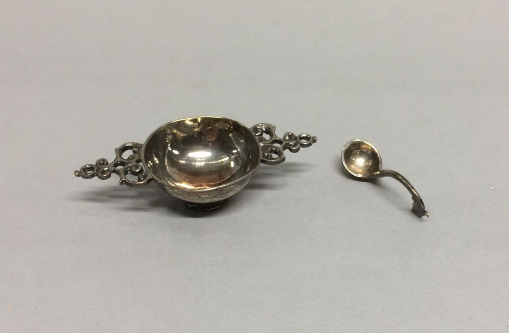 Zilveren miniatuur papkom met lepel