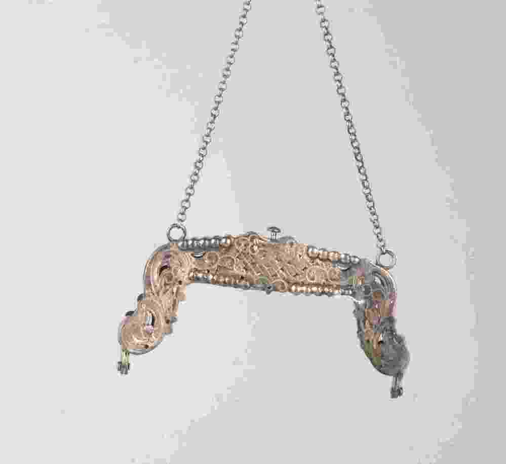 Zilveren tasbeugel met ketting, gegraveerd en gezaag...