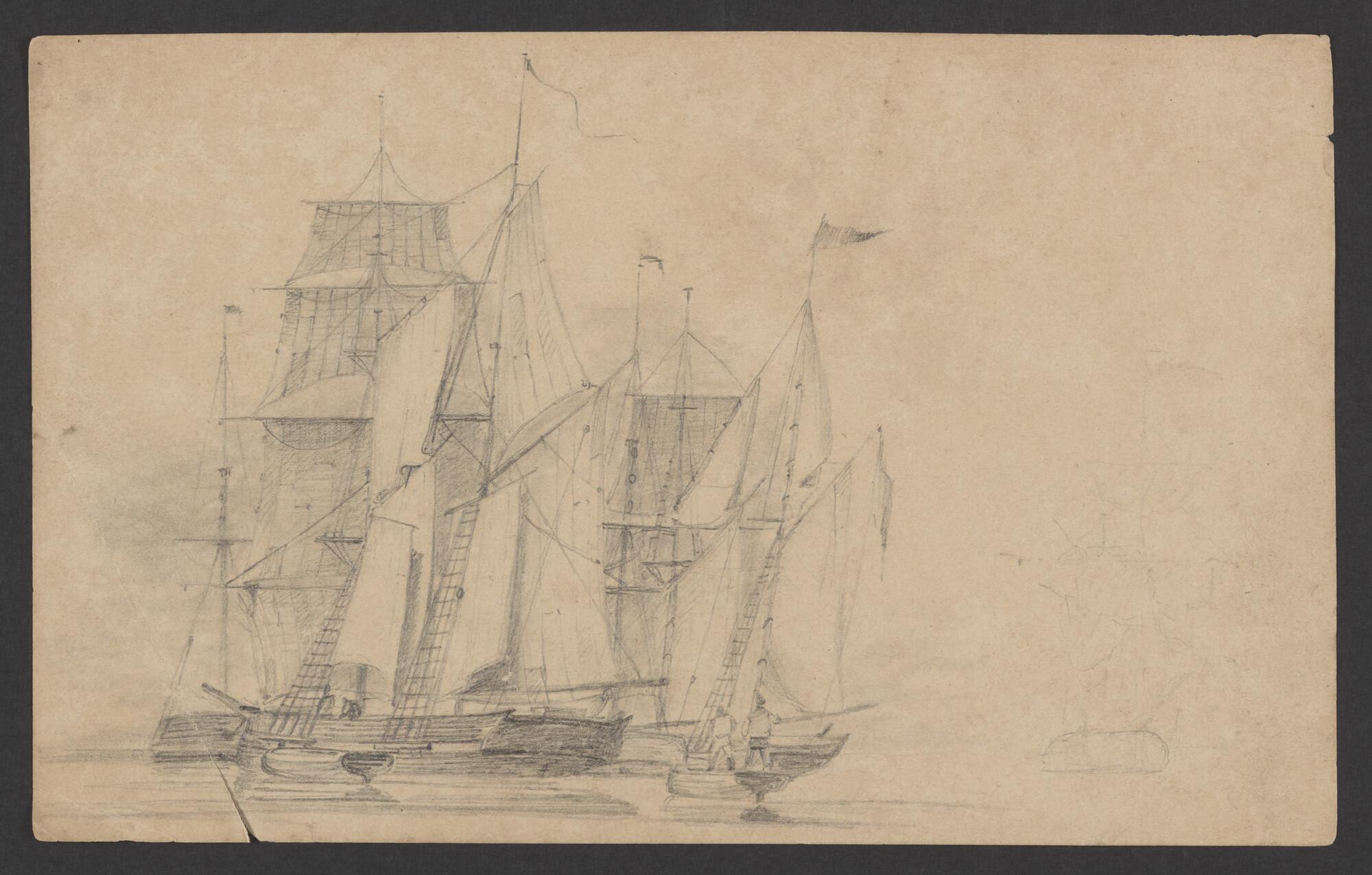 Tekening van twee langszij liggende zeilschepen