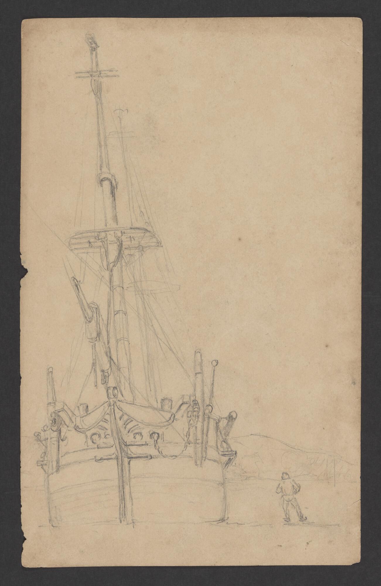 Tekening van een zeilschip gezien op de boeg