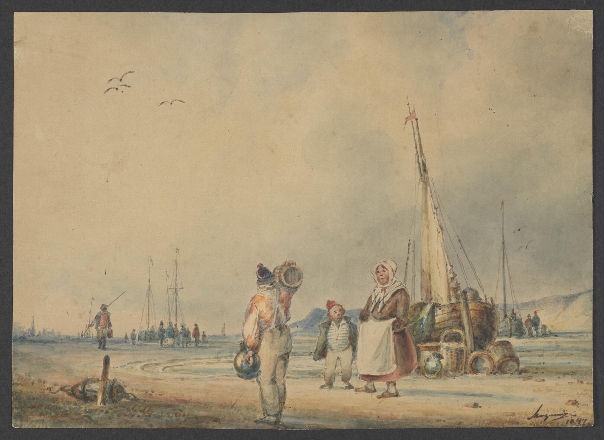 Gekleurde tekening, aquarel, van een strand met boms...