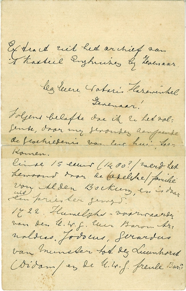Notitie van papier door Van Motz aan notaris Hazewin...