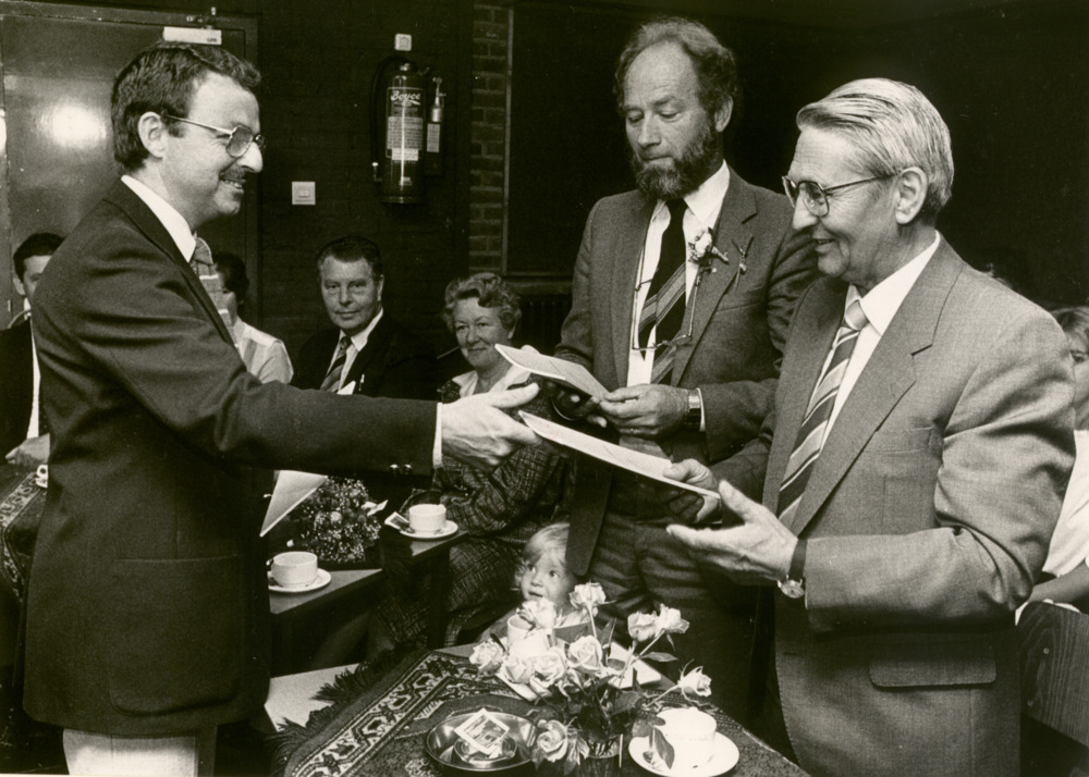 Zwart-wit foto van M. van Megen bij het aanbieden va...