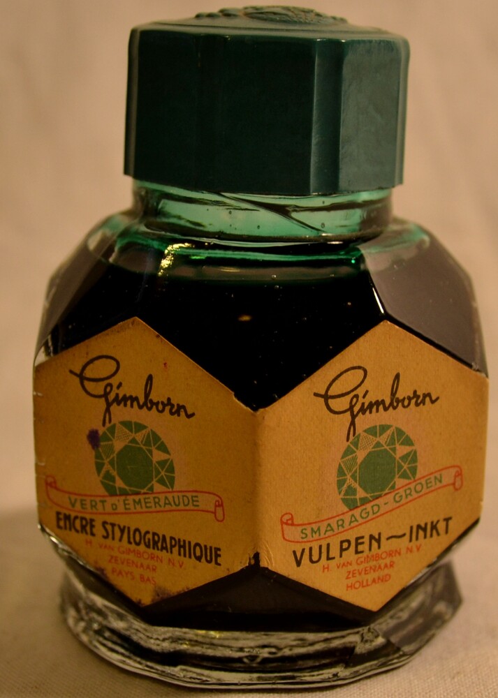 Inktpotje van glas gevuld met smaragdgroene vulpenin...