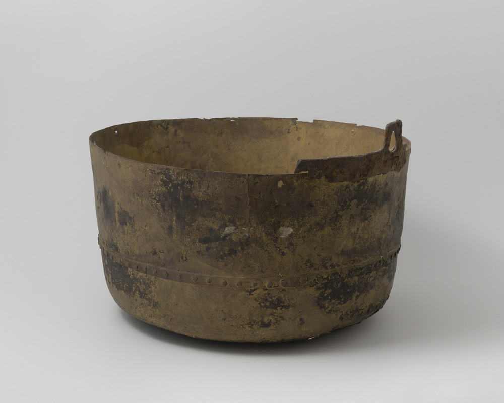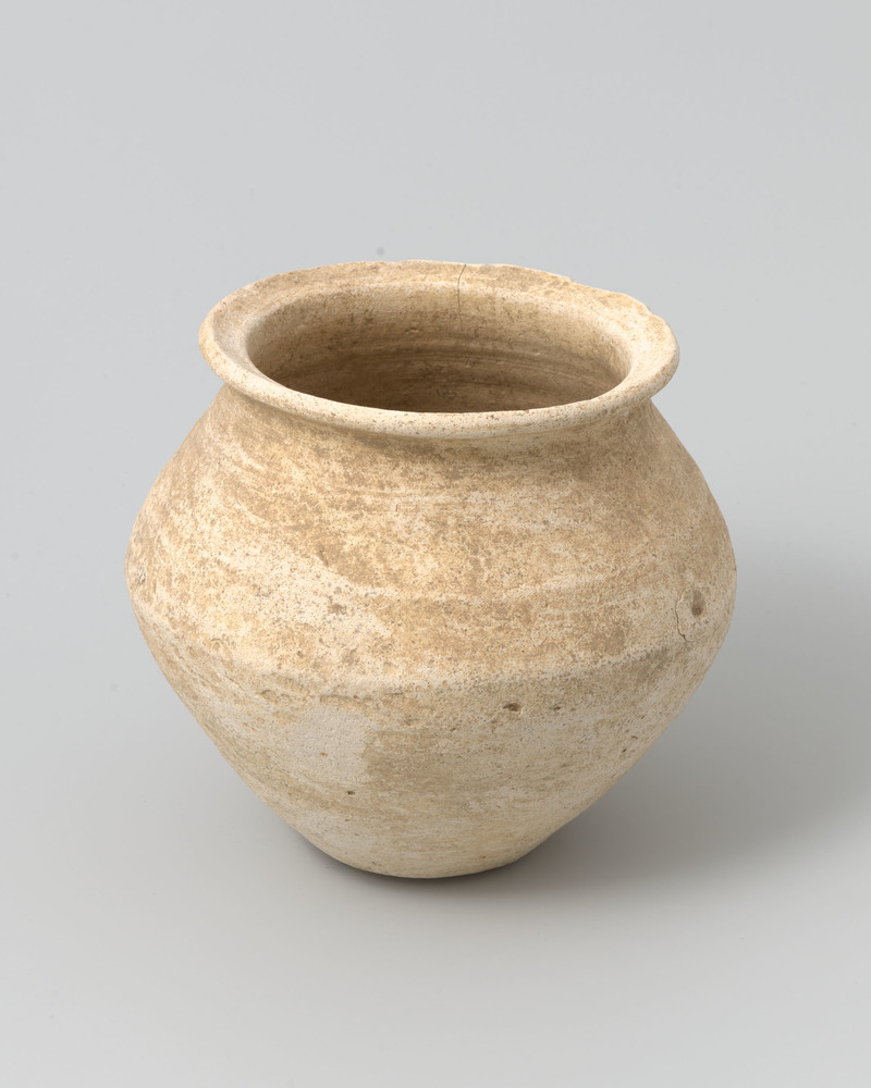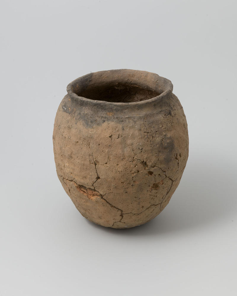 Grape van handgevormd aardewerk met gedraaide bovenrand