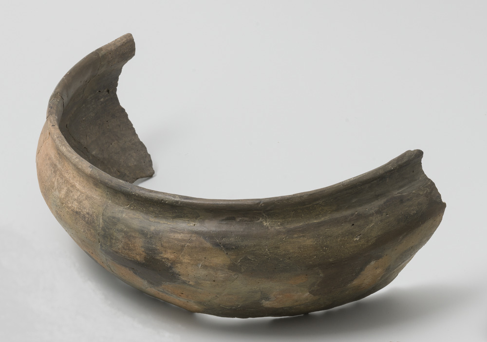 Grape van handgevormd aardewerk met gedraaide bovenrand