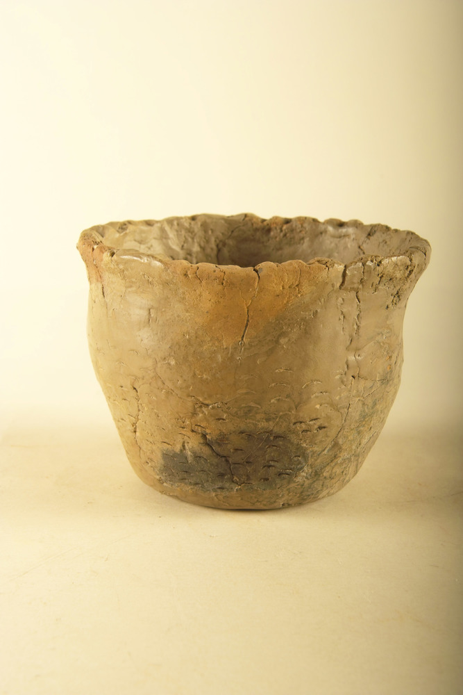 Grape van handgevormd aardewerk met gedraaide bovenrand