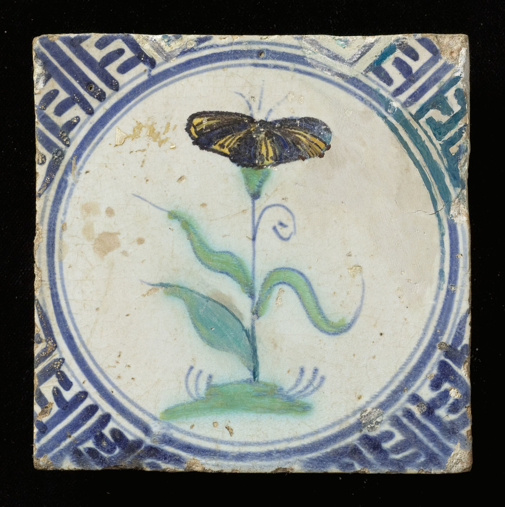 Tegel van keramiek, tinglazuur, voorstellende een bl...