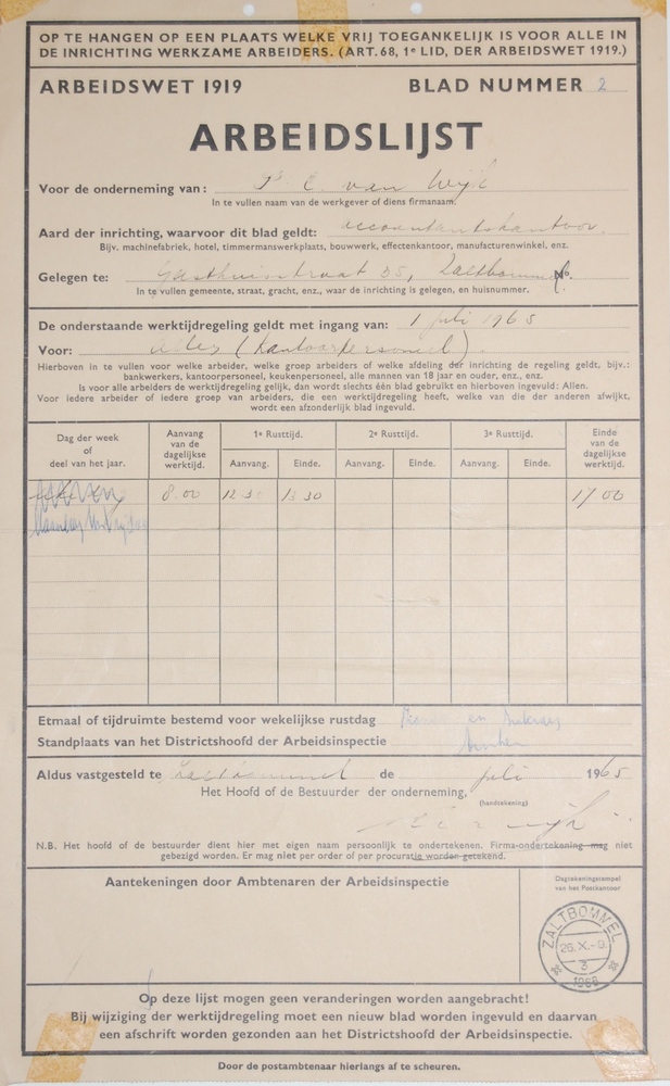 arbeidslijst t.b.v. Arbeidswet 1919 kantoor van Wijk...