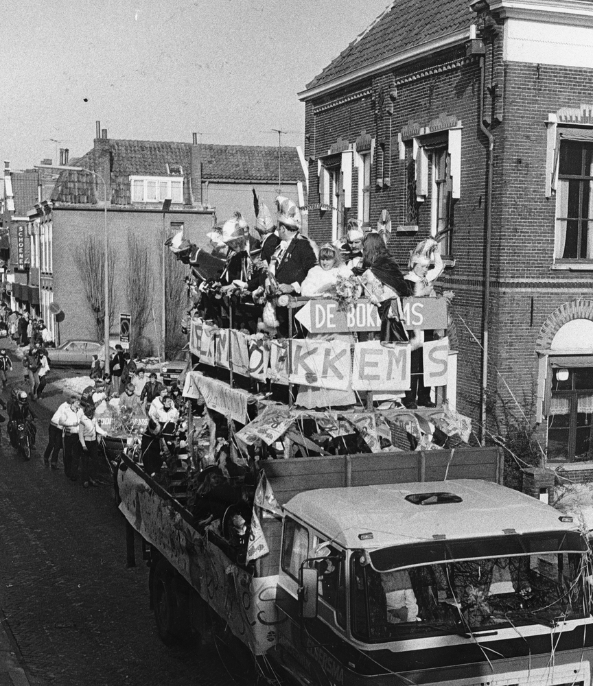 De carnavalswagen van De Bokkems tijdens een optocht...