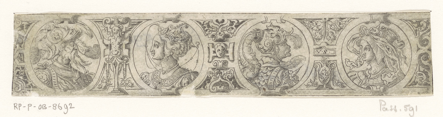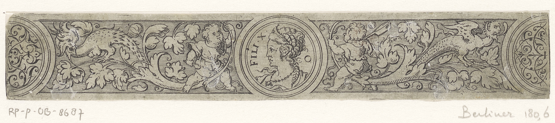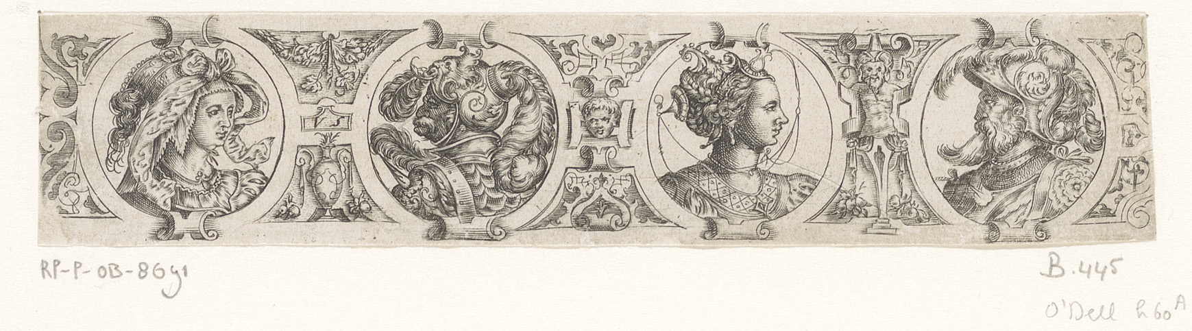Fries met vier bustes in medaillons binnen een rolwe...