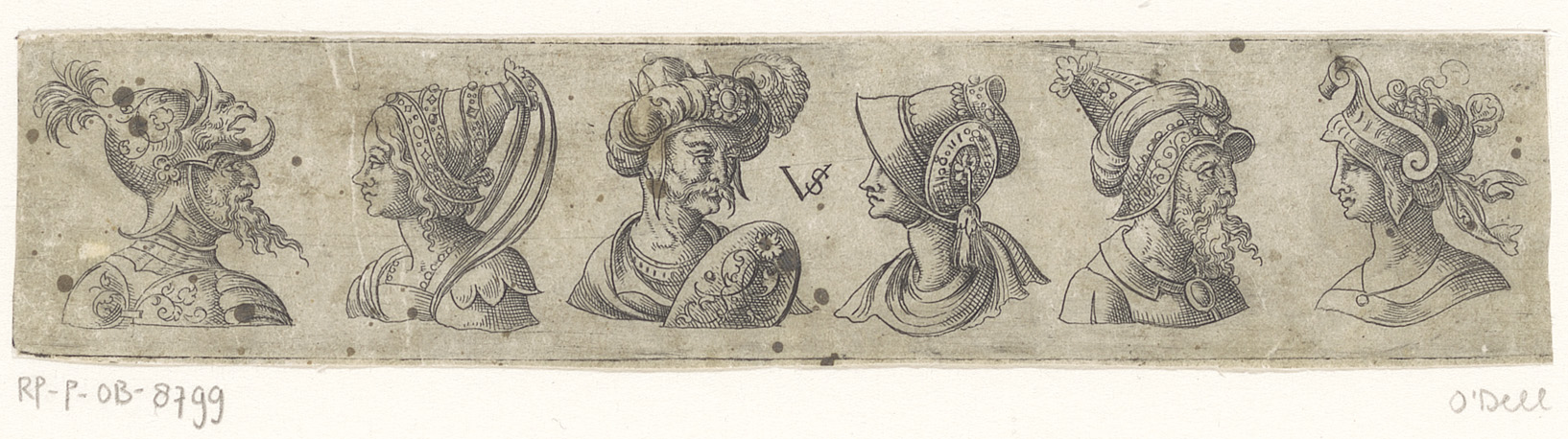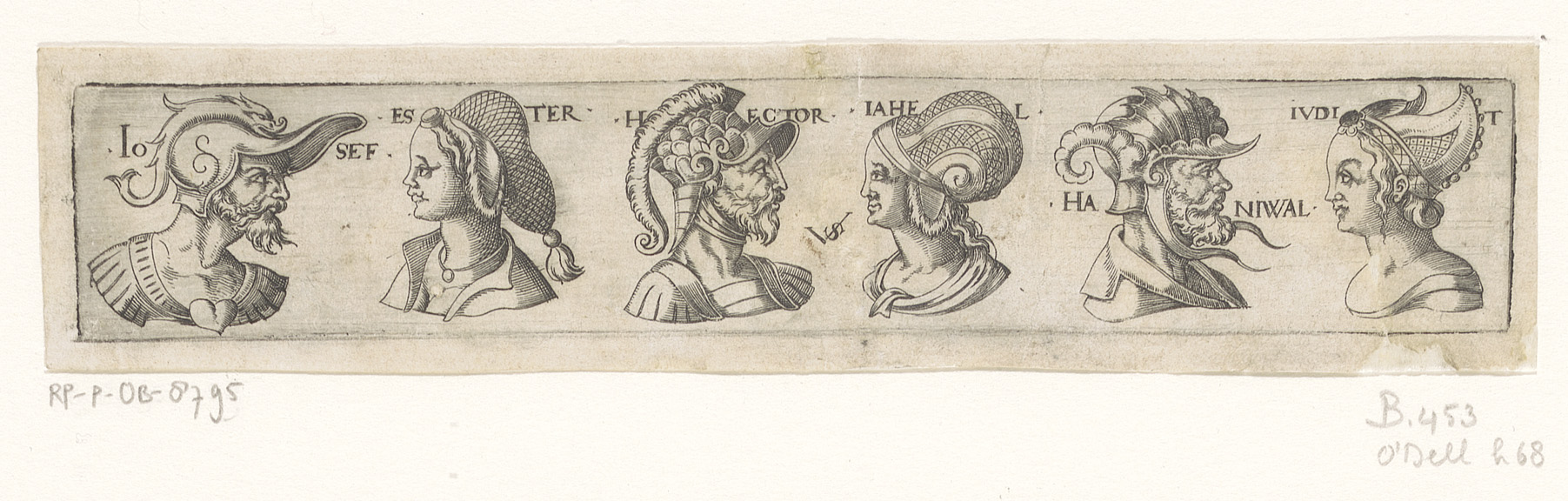 Fries met zes bustes met hoofddeksels