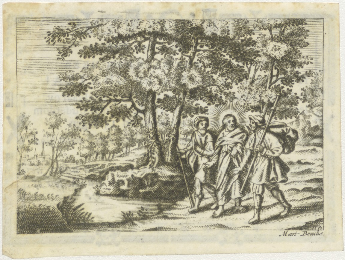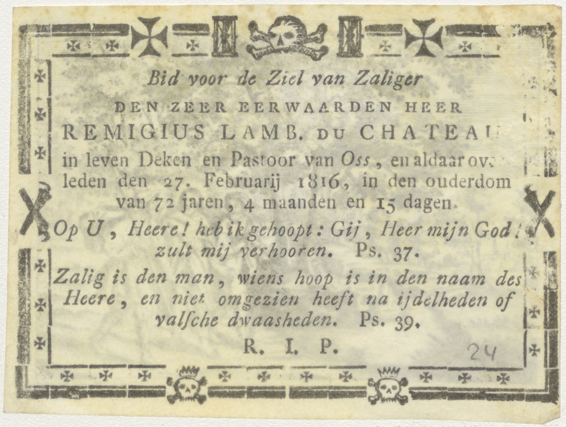Christus en de Emmausgangers, kz. Religieus;Bid voor ziel deken en pastor Remigius L. du Chateau (+1816) te Oss