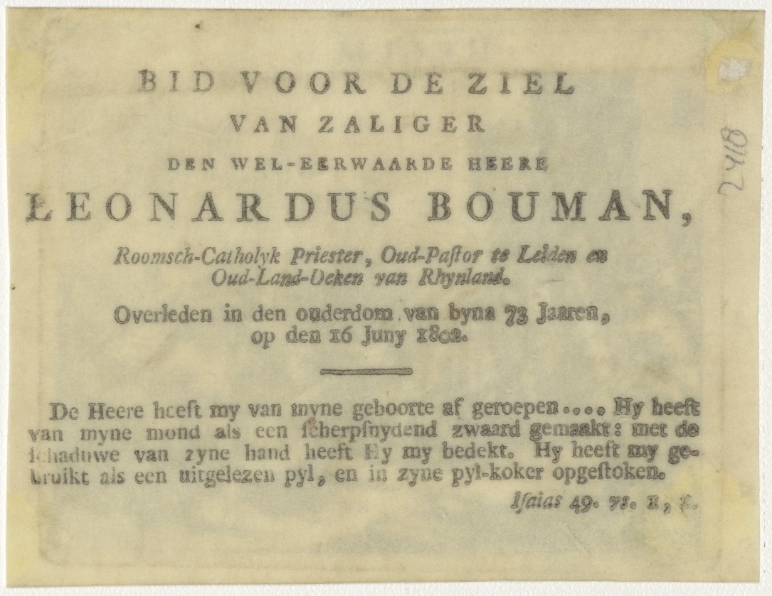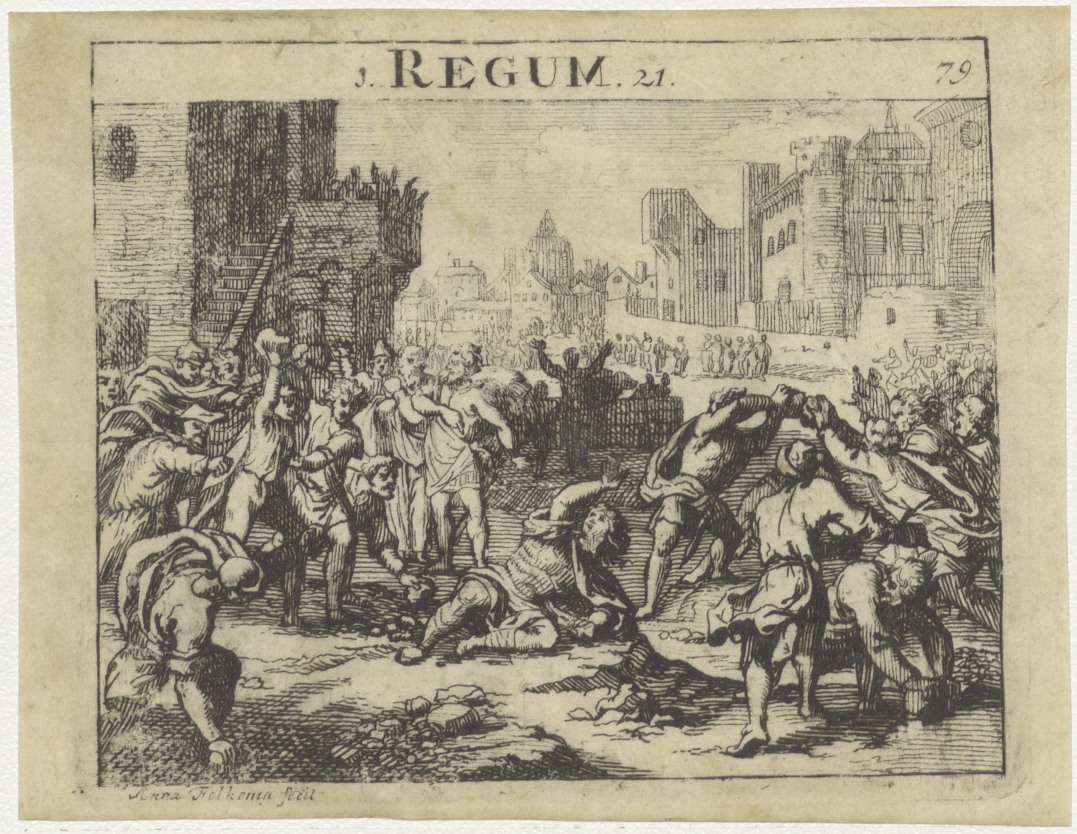 Steniging van Nabot (1 Kon.21), kz. Religieus;Bid voor ziel Leonardus Bouman (+1802);pastoor te Leiden;Oud land-deken Rhijnland;