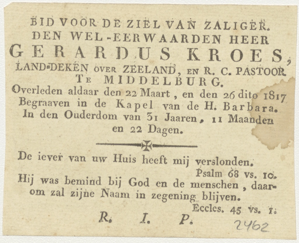 H. Familie (Luc.2:14), kz. Religieus;Bid voor ziel Gerardus Kroes (+1817);Land-deken over Zeeland;pastoor Middelburg;