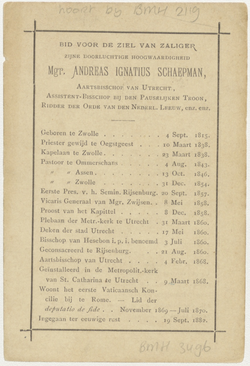 Gebed voor overledene Andreas Schaepman, kz. Religieus; bid voor ziel Andreas Schaepman (+1882) deken van Utrecht, aartsbisschop Utrecht