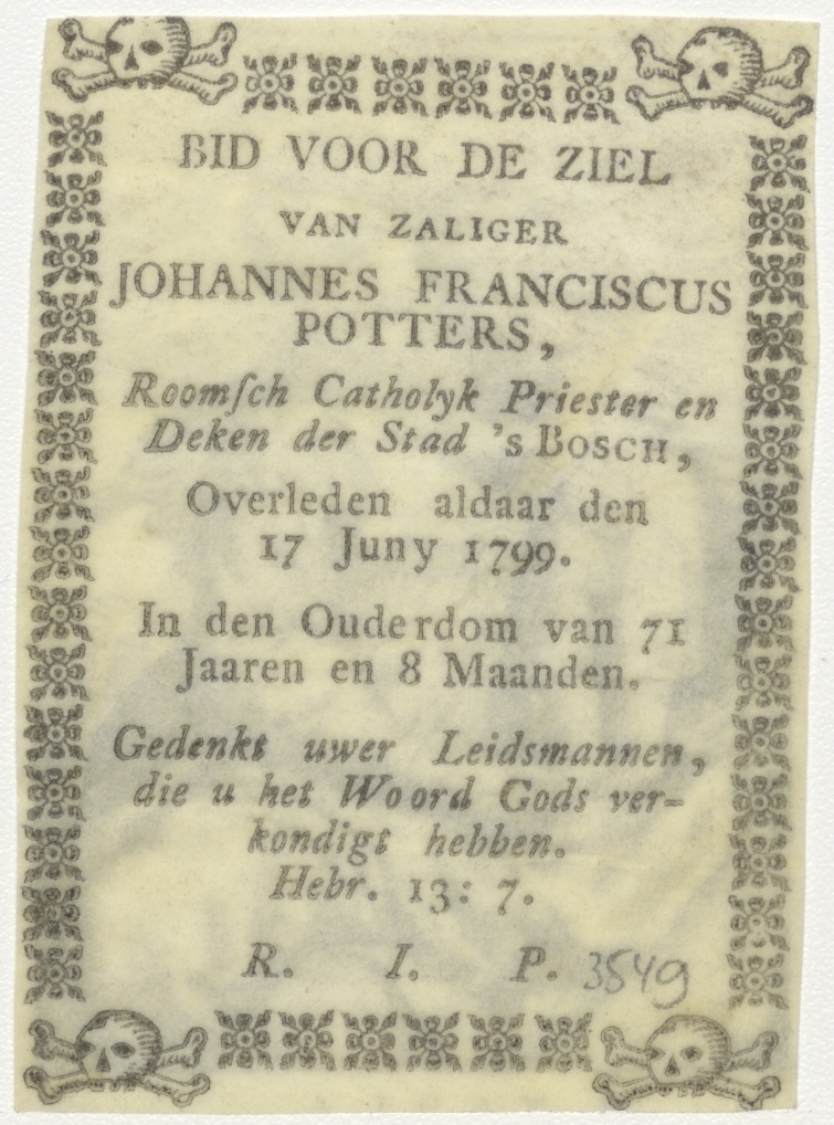 Maria met Christuskind, kz. Religieus; bid voor ziel Joannes Potters (+1799) deken Den Bosch