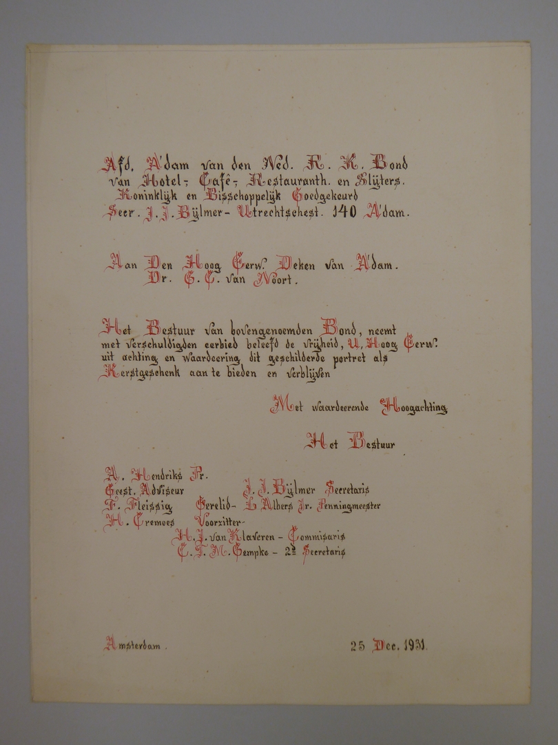 Oorkonde t.g.v. aanbieding portret aan dr. G.C. van Noort, deken van Amsterdam
