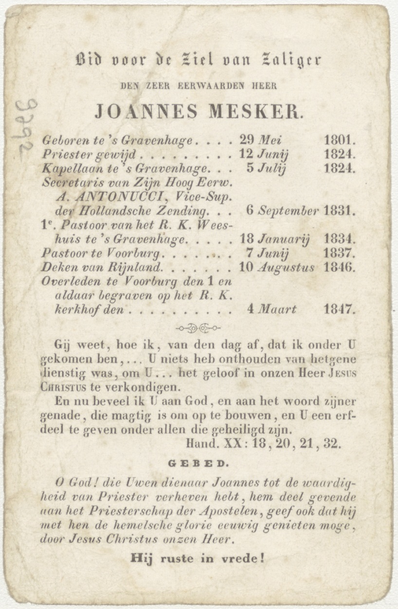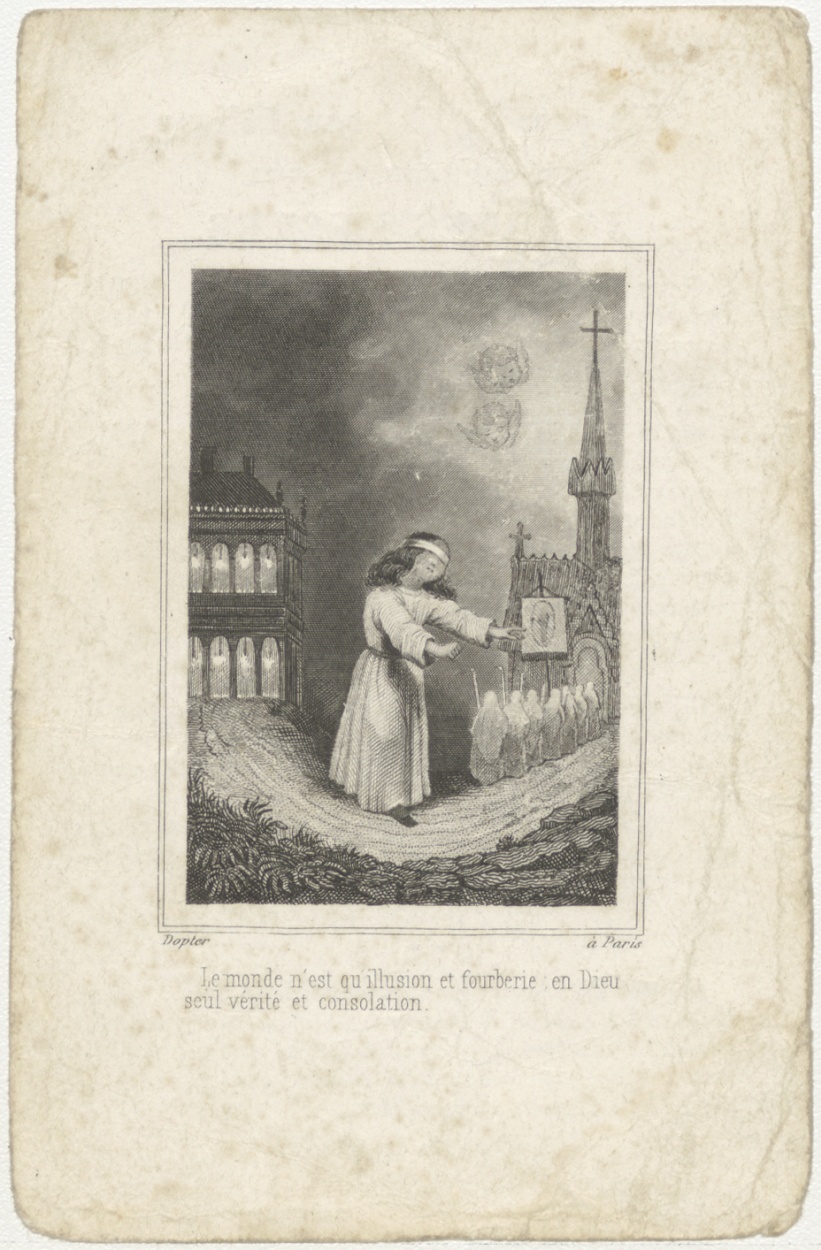Geblindoekt, zoekend kind (Frans), kz. Religieus; bid voor ziel Joannes Mesker (+1847) pastoor Voorburg, deken Rijnland