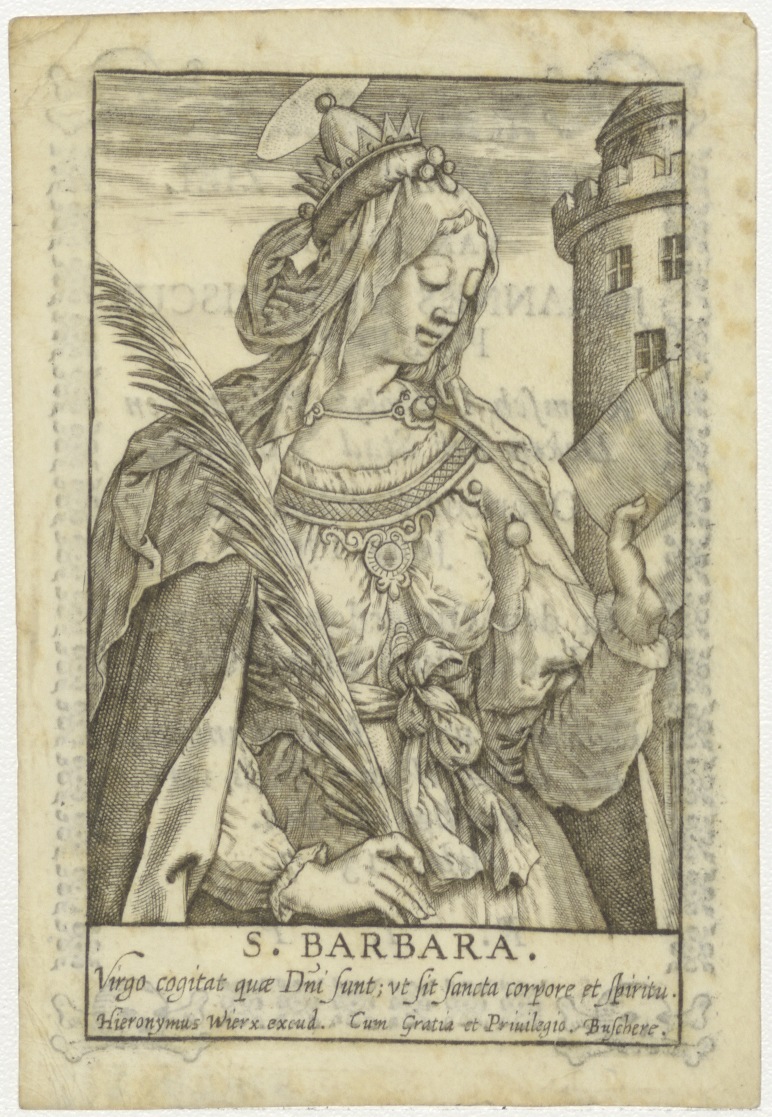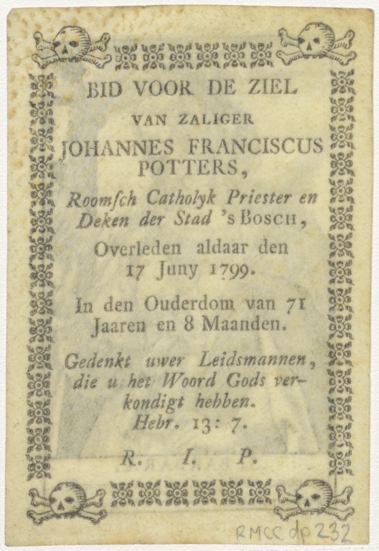 H. Barbara met boek en palmtak voor toren, kz. Religieus;Bid voor ziel Johannes Franciscus Potters (+1799) Den Bosch, priester en deken te Den Bosch