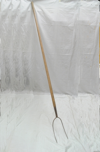 Grotere hooivork met aan het uiteinde van de lange houten steel een ijzeren tweetandige riek