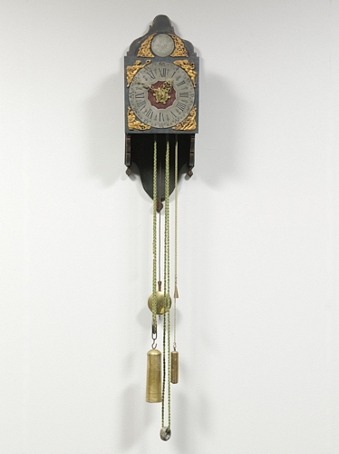 Hangklok – ca. 1765, hout, messing, ijzer en lood, 65 x 26 x 20 cm, rechthoekige kast met ronde ijzeren wijzerplaat met de uren in romeinse cijfers en de minuten in arabische cijfers en daarboven ronde ijzeren makersplaat met inschrift: ‘P. van Bufsel à Asten’, ijzeren kettingen met gewichten van messing/lood