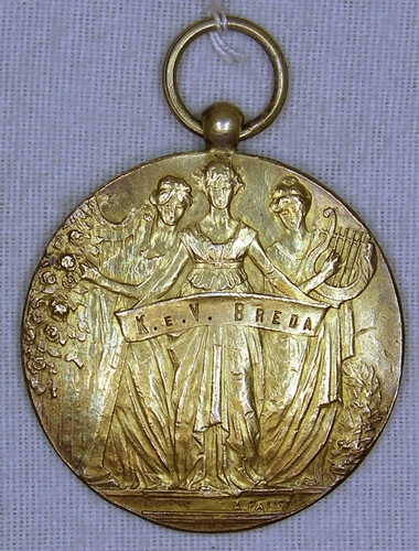 Medaille St. Cecilia Eindhoven - z.j., zilver, verguld, diam. 50 mm, dikte 3 mm, gesigneerd vz.: ´A. FALISE´, opschrift vz.: ´K.E.V. BREDA´, opschrift kz.: ´1E PR. 2E AFD. 388 P ST. CECILIA EINDHOVEN´