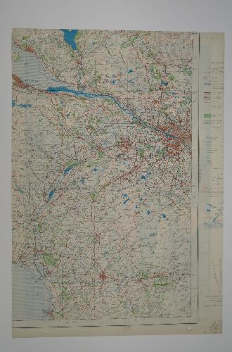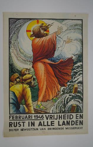affiche met afbeelding van staande Jezusfiguur met apostelen op woeste zee, door Jos Speybrouck, daaronder de tekst: februari 1946 vrijheid en rust in alle landen, dieper bewustzijn van dringende missieplicht wegens papierschaarste kort na de oorlog gedrukt op de blanco achterkant van reeds bedrukte vellen. Gedrukt in België. Zie ook inv.nr 2001.09.40