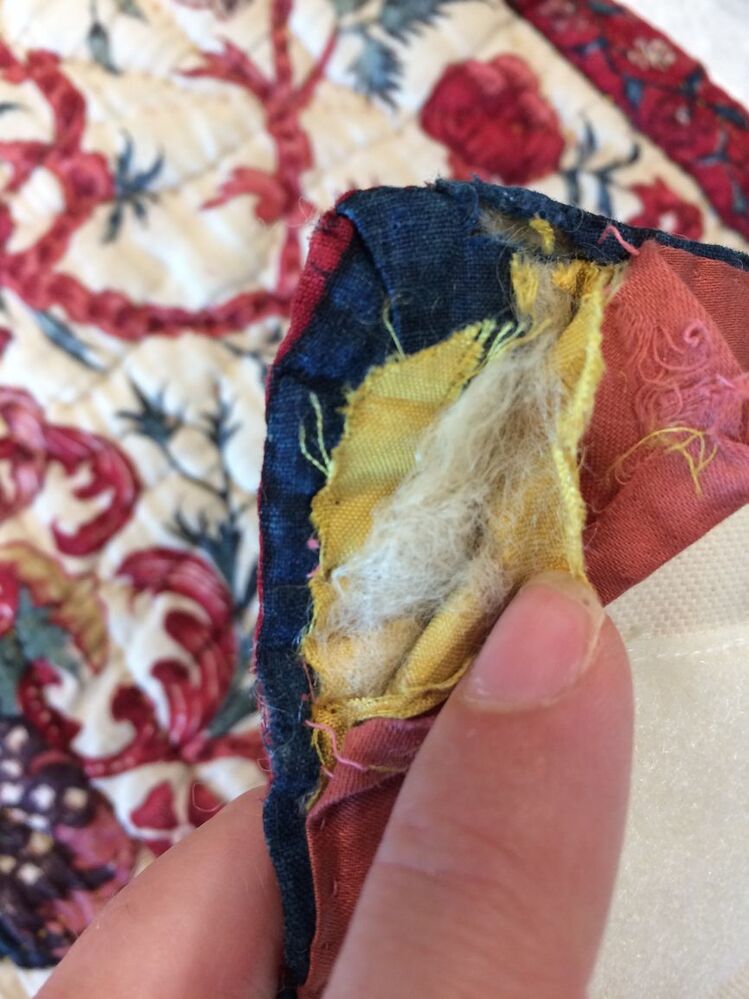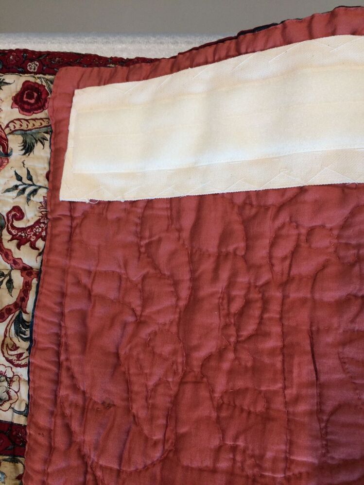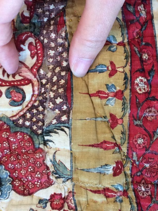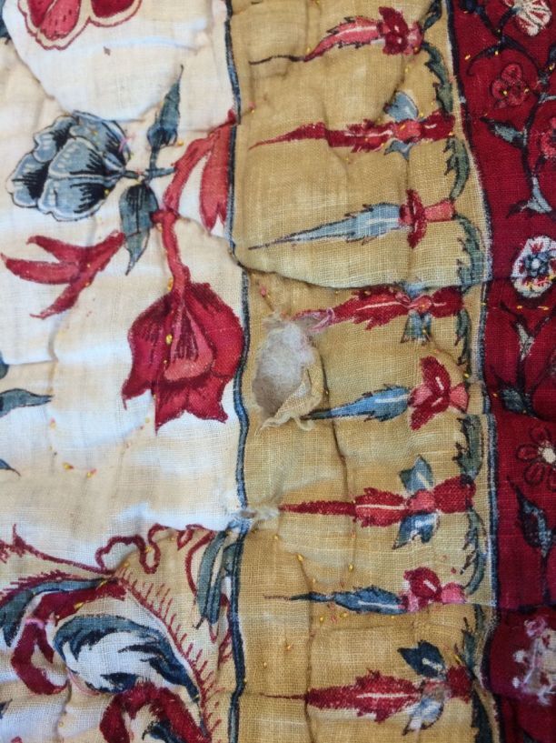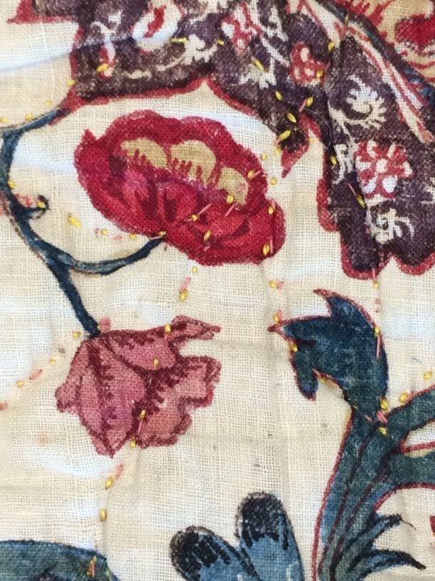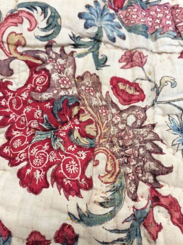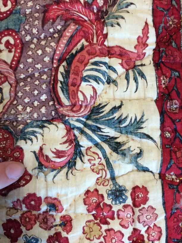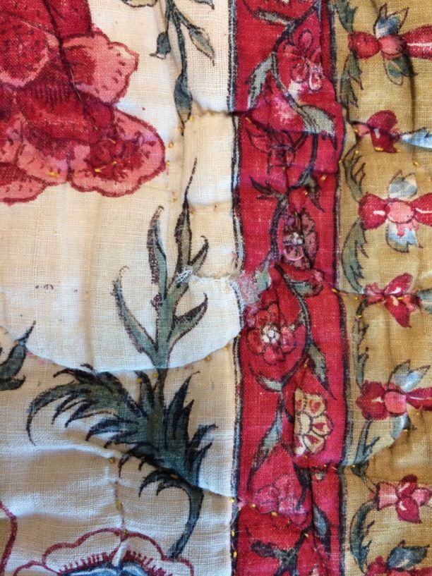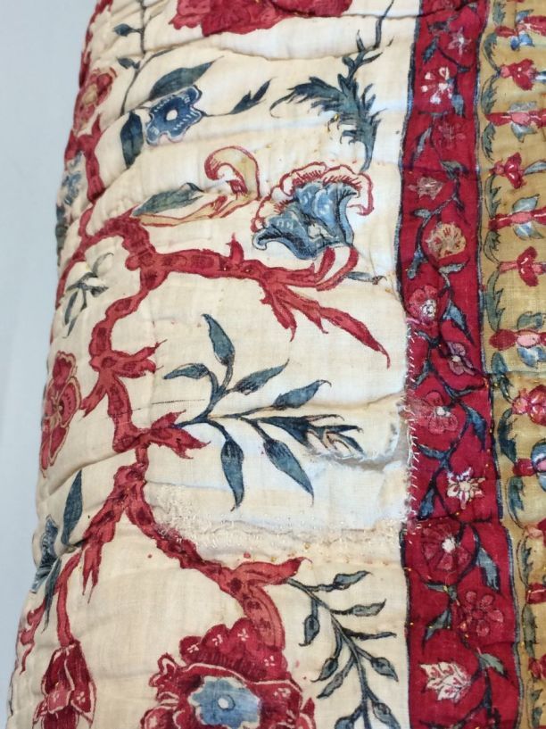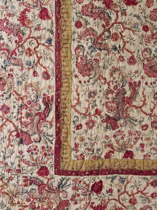 Sitsen deken waarvan middenveld en rand met dezelfde asymmetrische vormen waaruit diverse bloemranken ontspruiten, op witte grond