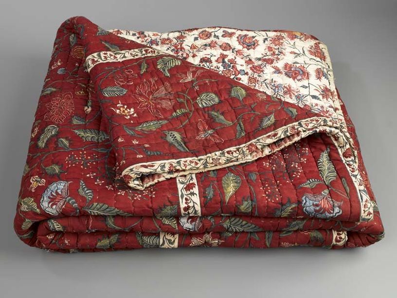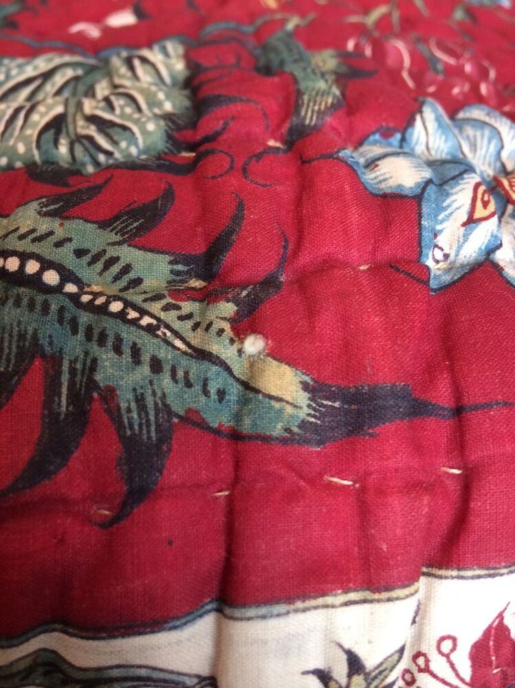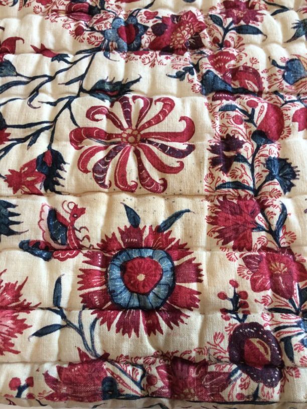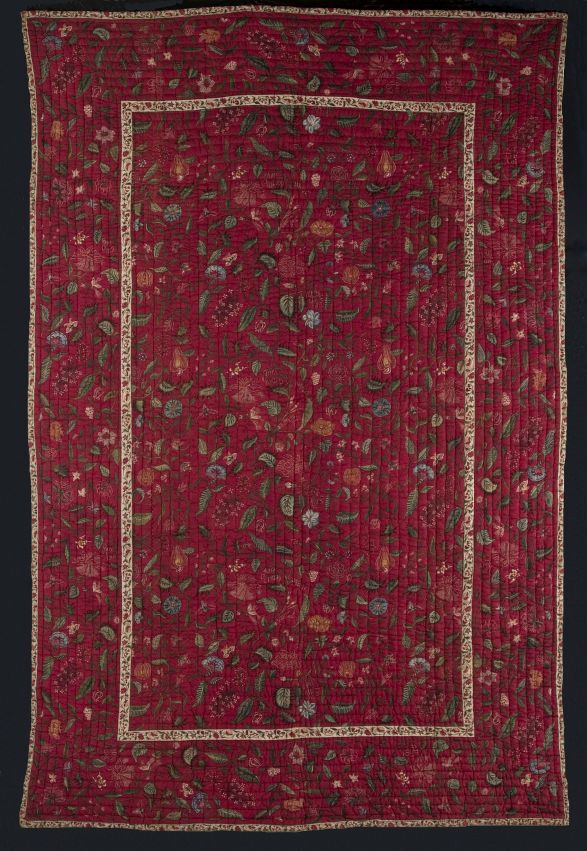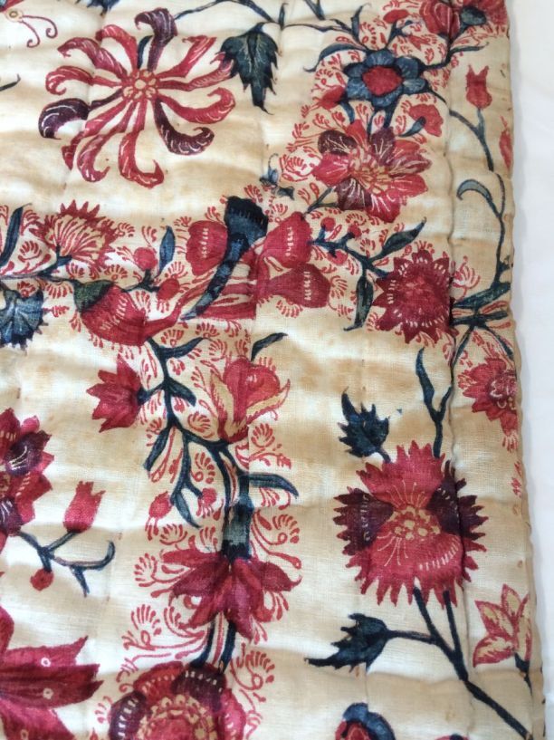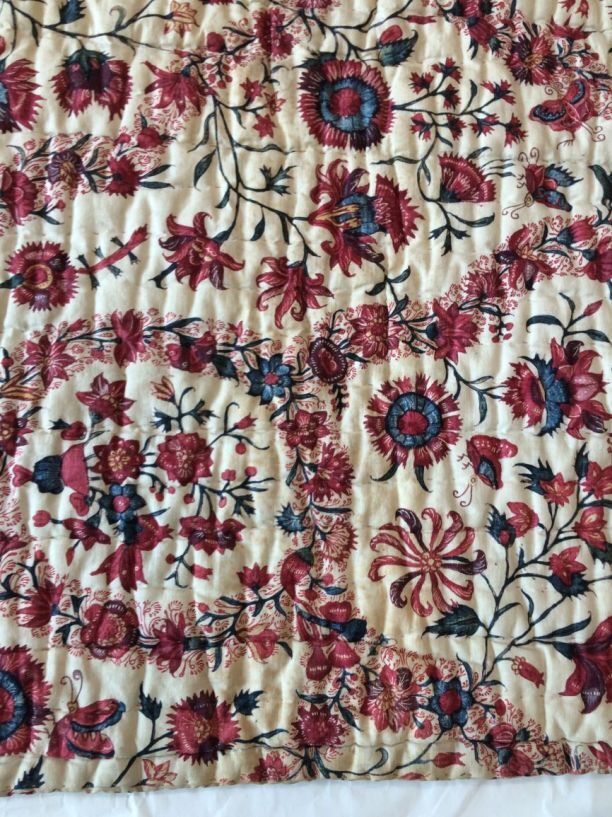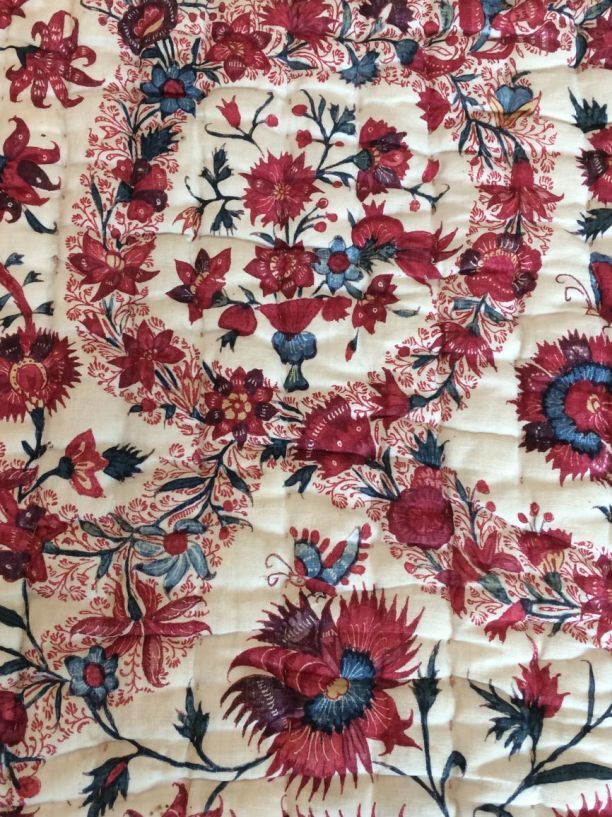 Sitsen deken met krullende ranken in middenveld en rand op rode grond, gevoerd met sits met bloemslingers op witte grond