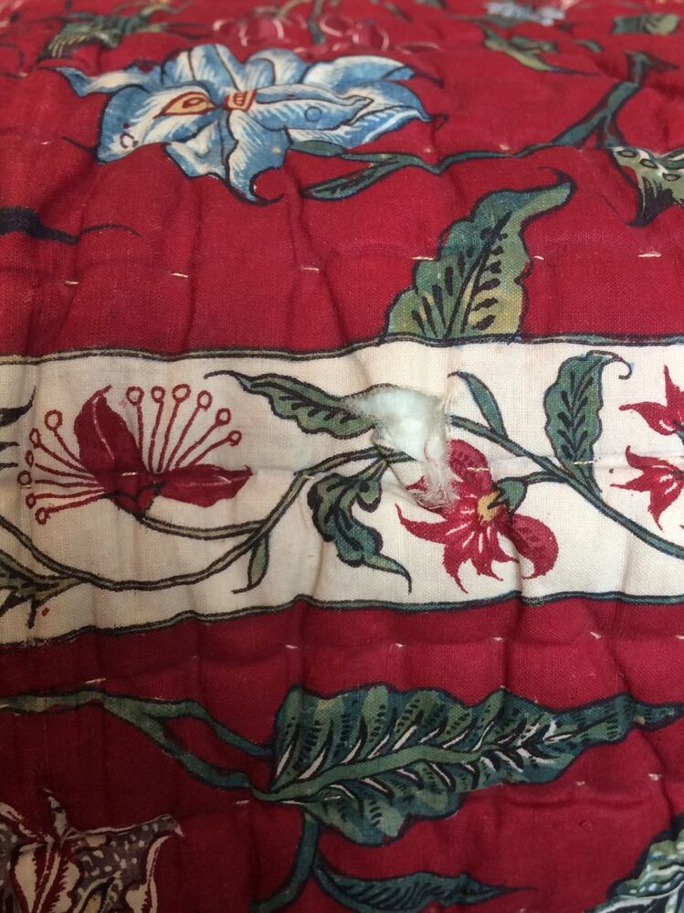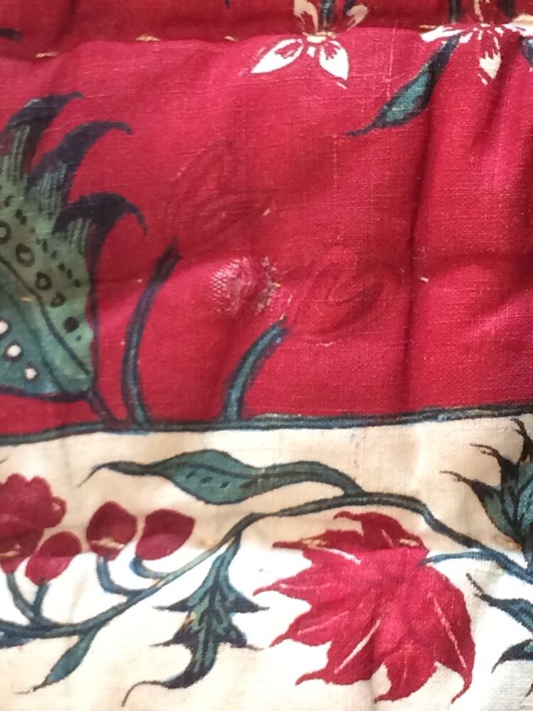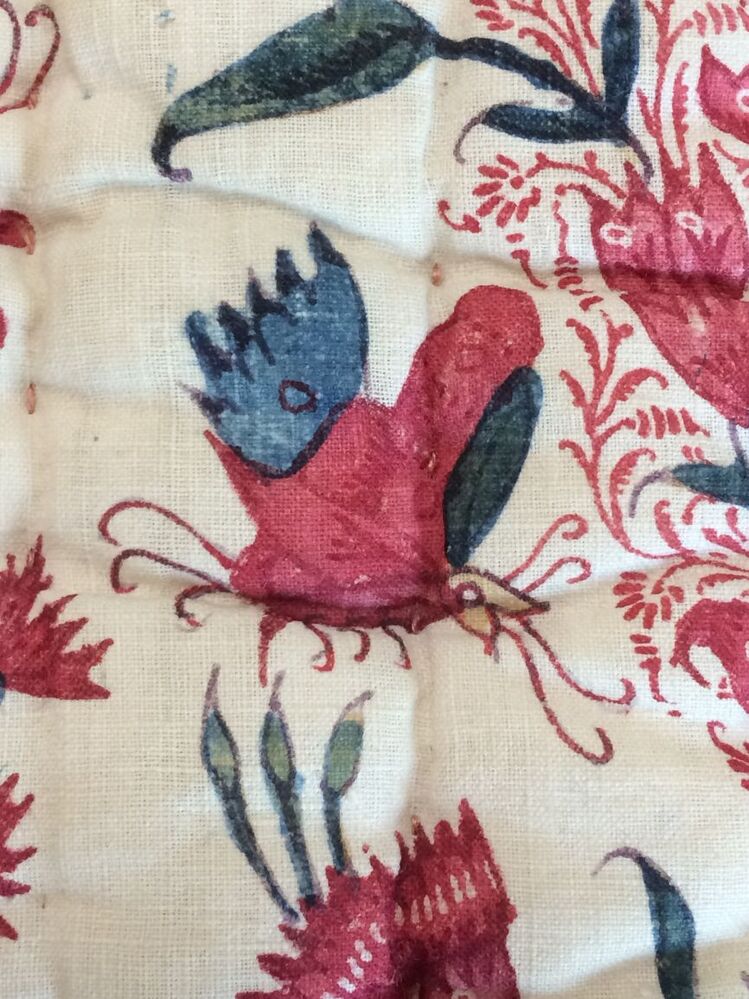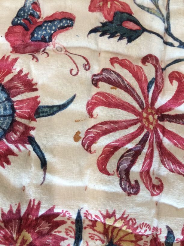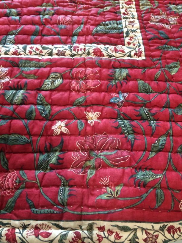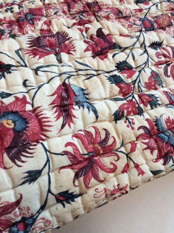 Sitsen deken met krullende ranken in middenveld en rand op rode grond, gevoerd met sits met bloemslingers op witte grond