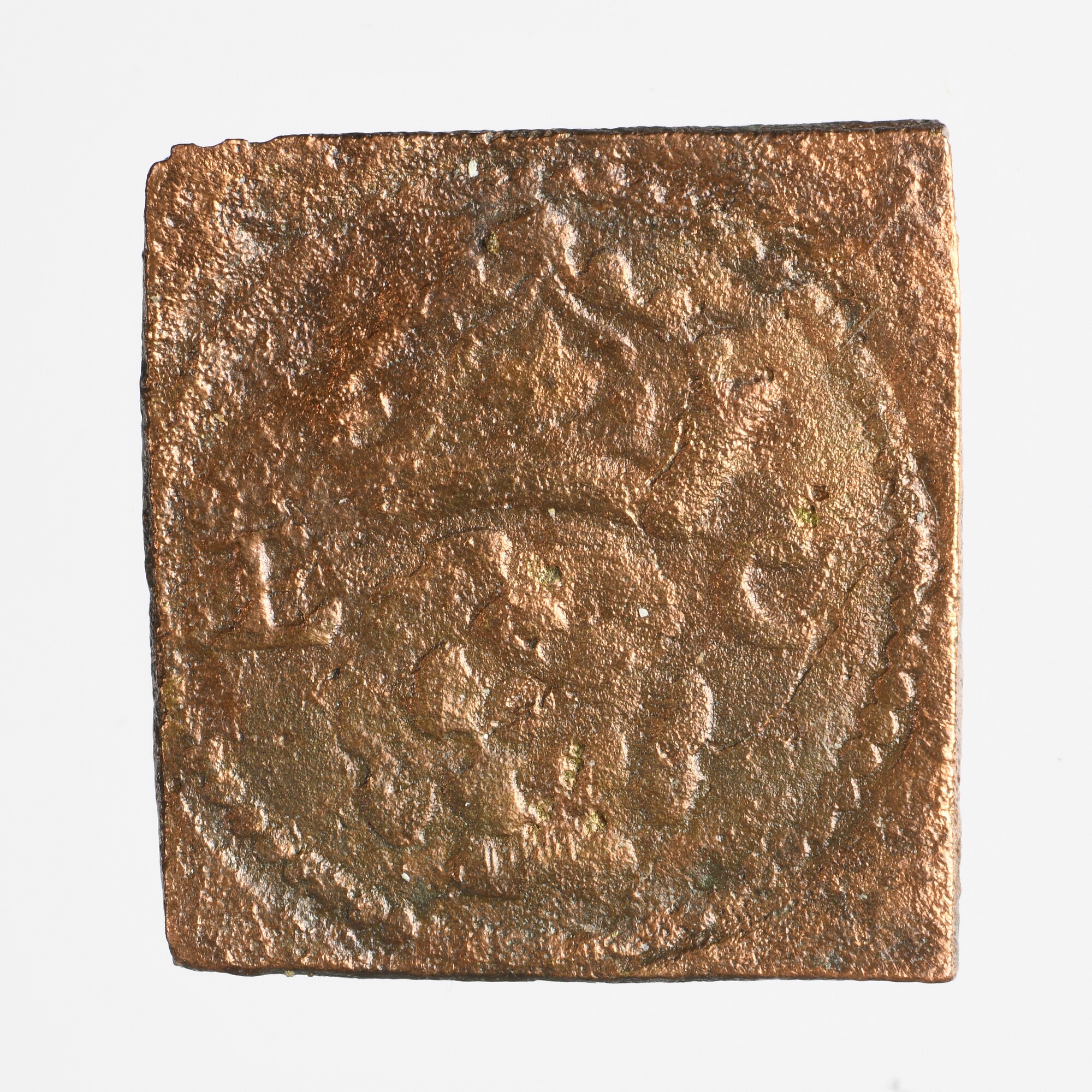 Muntgewicht 1/4 pound (1526-1544); vz.: tulpenkrans met daarbinnen onleesbare voorstelling; kz.: binnen cirkel een gekroonde bloem met aan weerszijden E - C; vervaardiger: Lenaart III van de Gheere; herkomst: Amsterdam; gewicht: 3.20 gram
