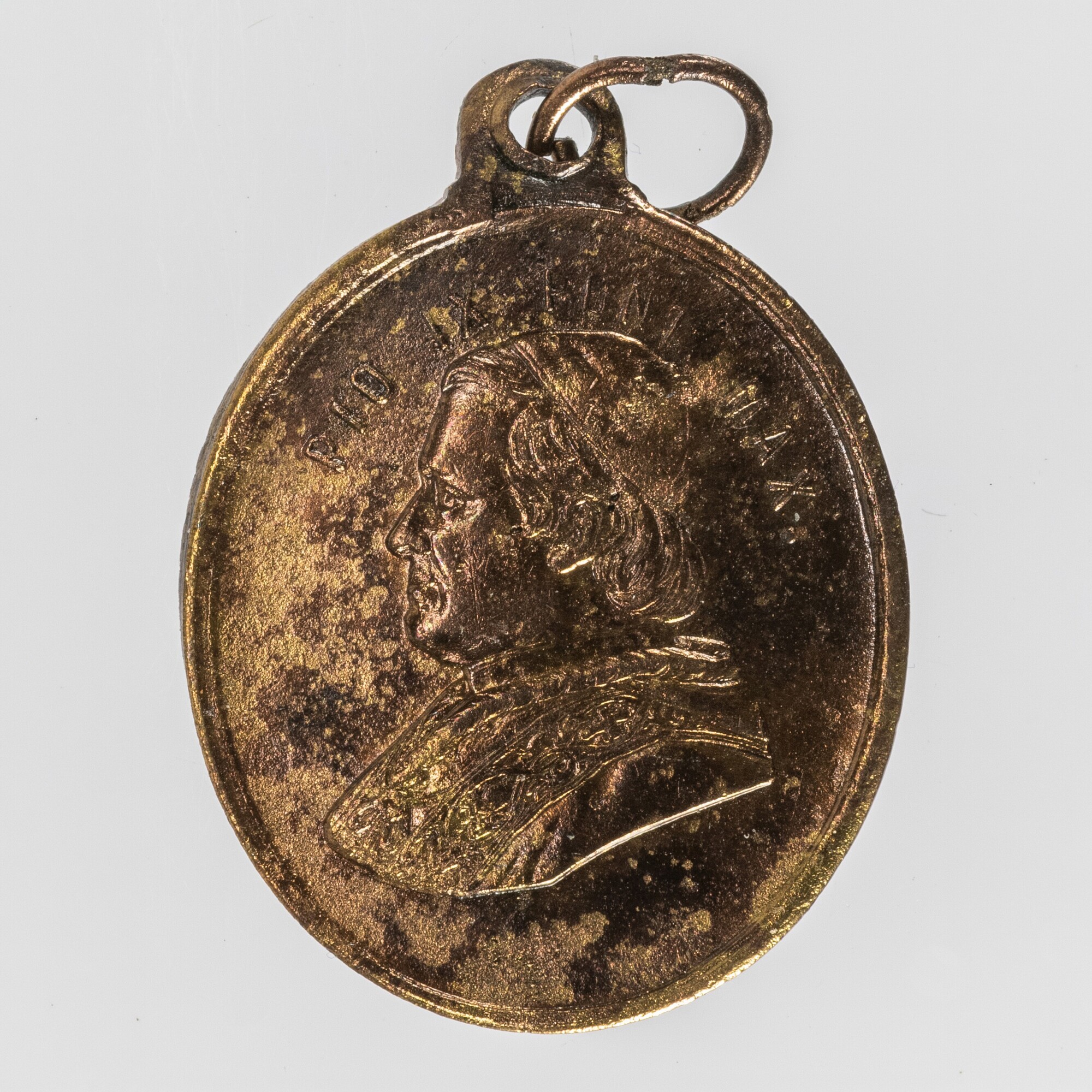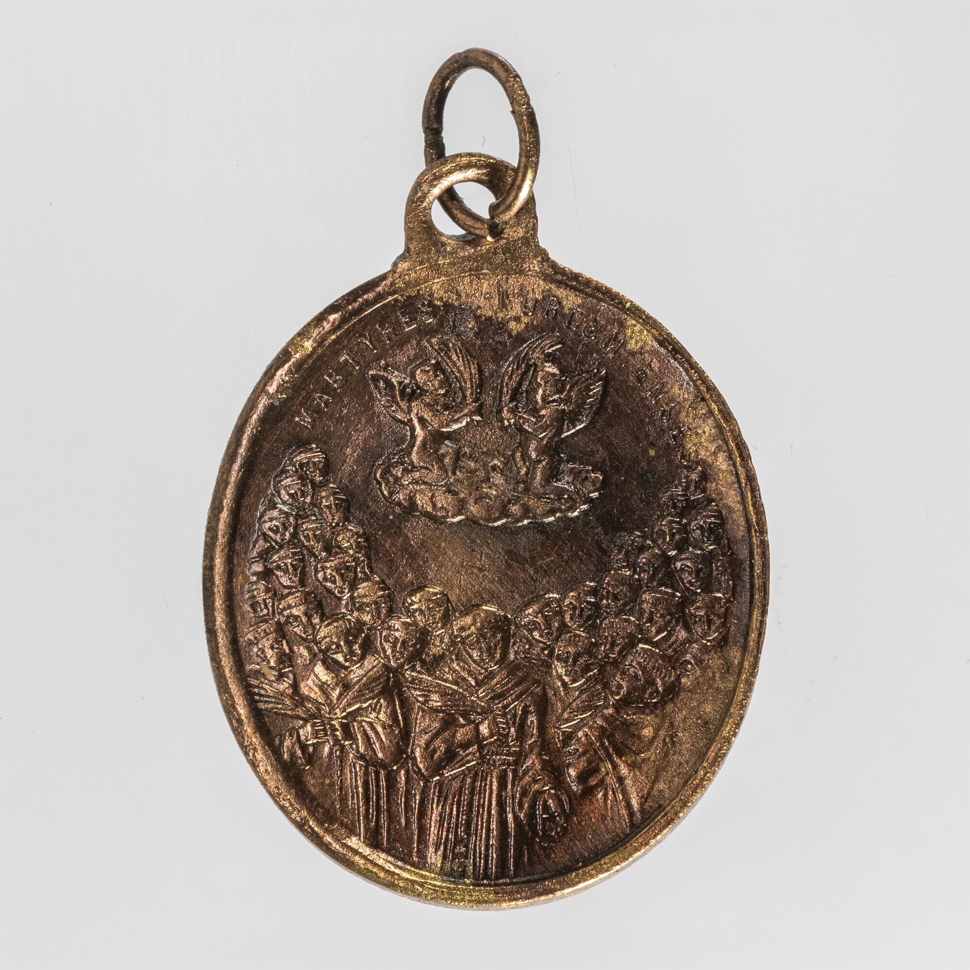 Hanger; scapulier; ter gelegenheid heiligverklaring Martelaren van Gorcum; vz.: buste paus Pius IX, omschrift: PIO IX PONT MAX; kz.: monniken en 2 engelen op wolk, omschrift: MARTYRES GORCUMIENSES