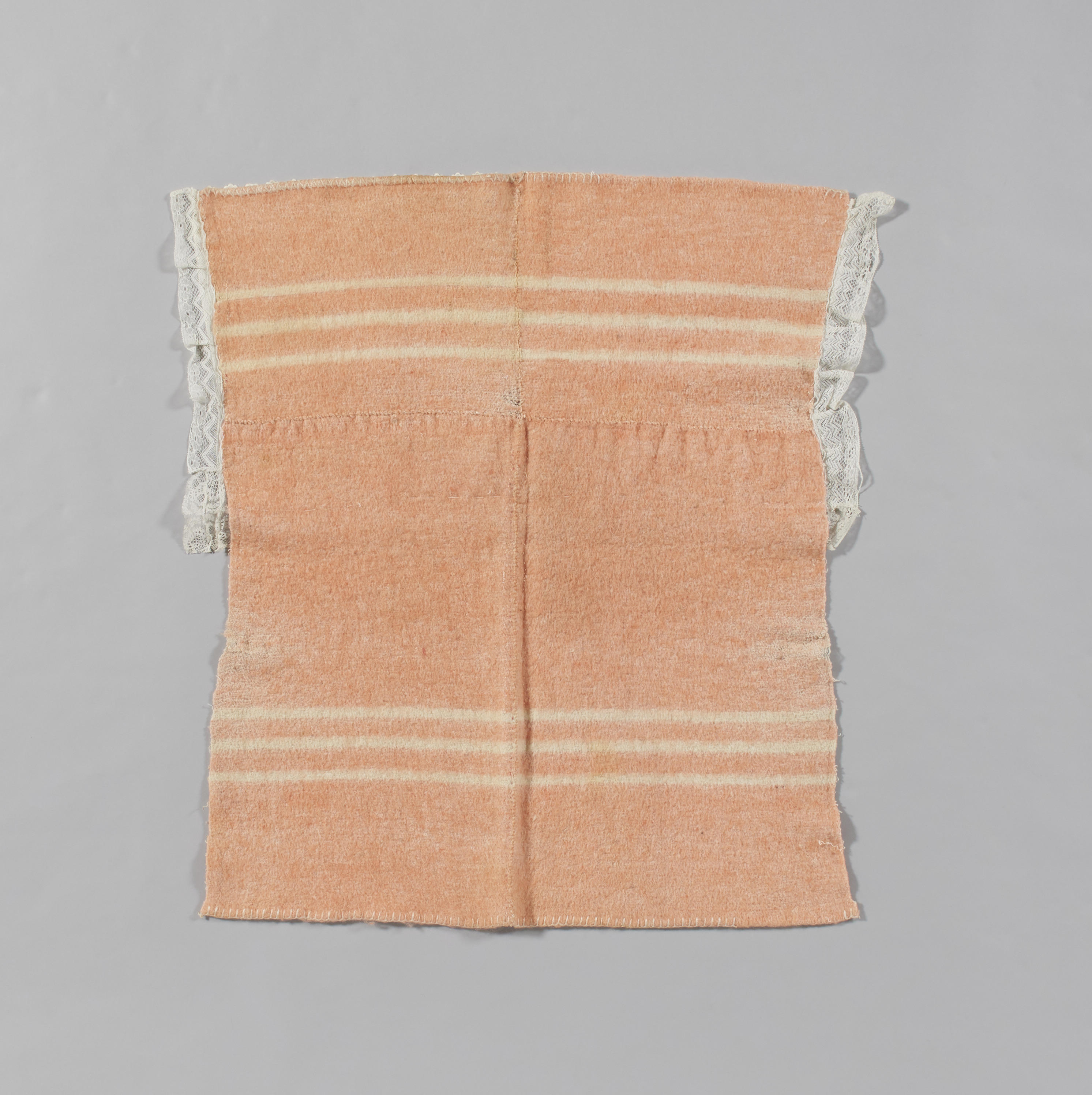 Wollen babydeken, versierd met witte broderie, tule en kant. De deken is waarschijnlijk gebruikt als pakdeken voor een dopeling.