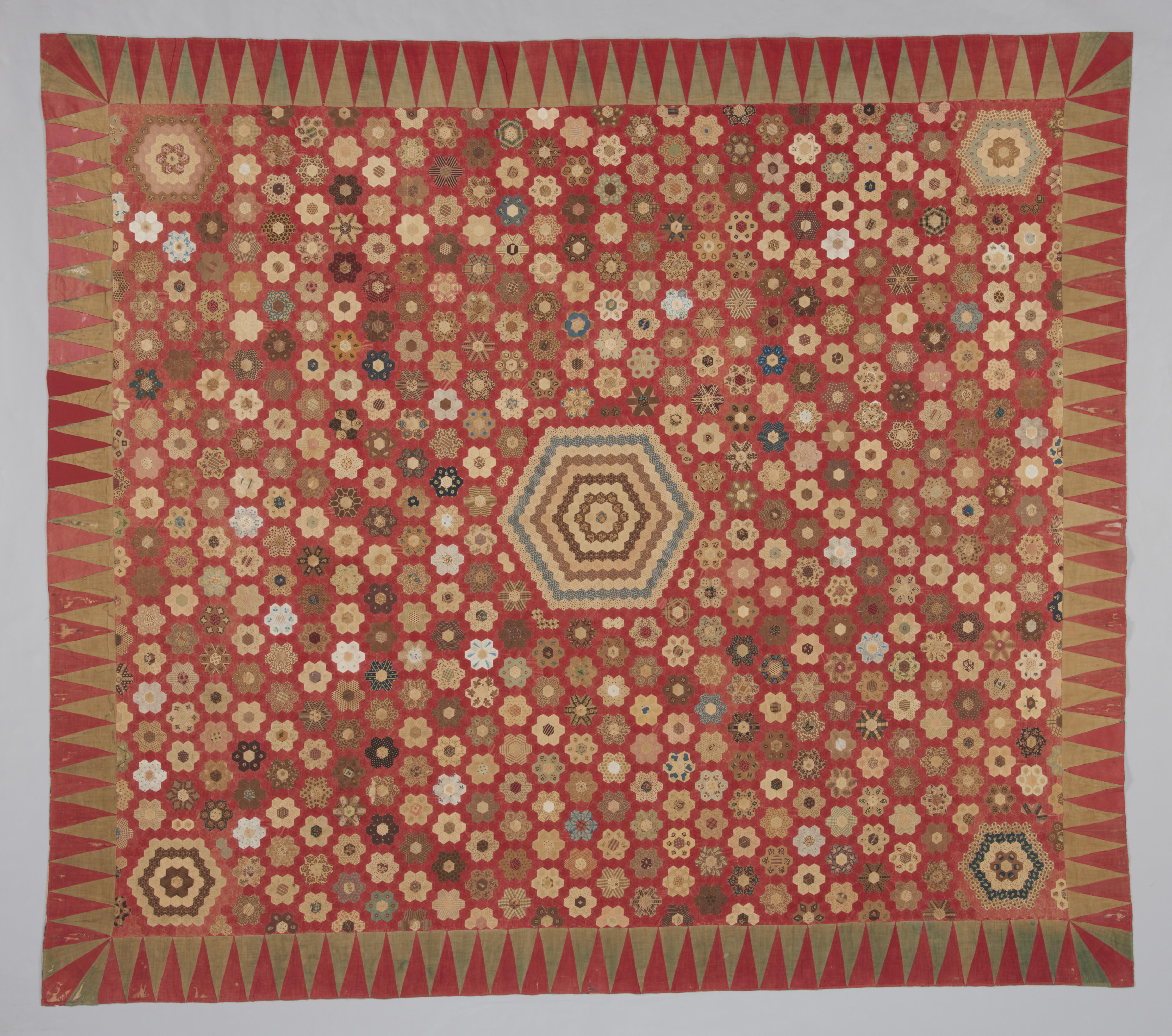 De bovenzijde van deze lappendeken is gemaakt van bedrukte en effen katoenen zeshoekige en driehoekige lapjes. De deken zou gemaakt zijn door twee gezusters Van Leeuwen, halverwege de negentiende eeuw in Monnickendam. Later zouden zij de deken aan een bekende hebben geschonken. Het patroon bestaat uit een groot middenrozet van tien toeren en rozetten van ...