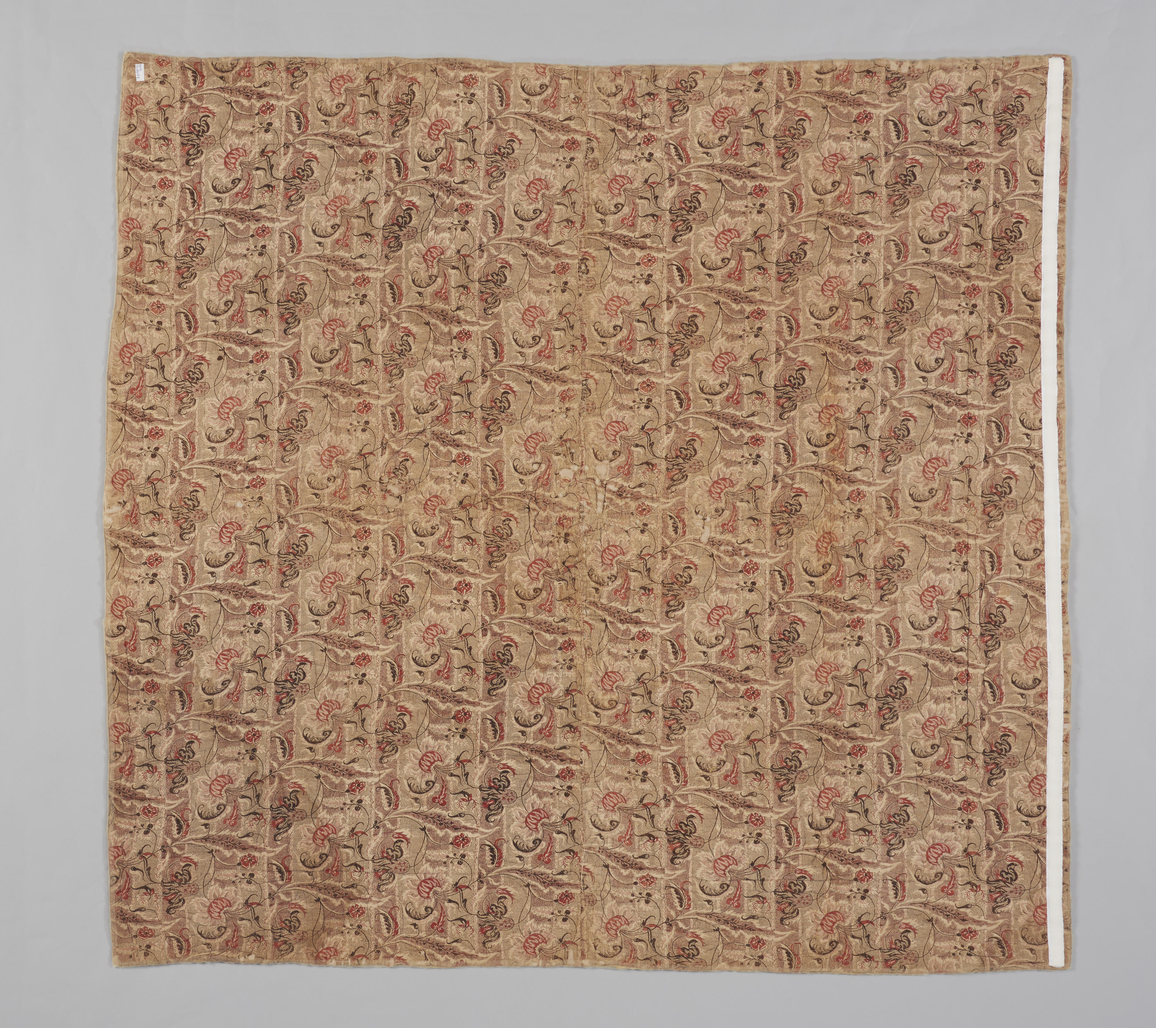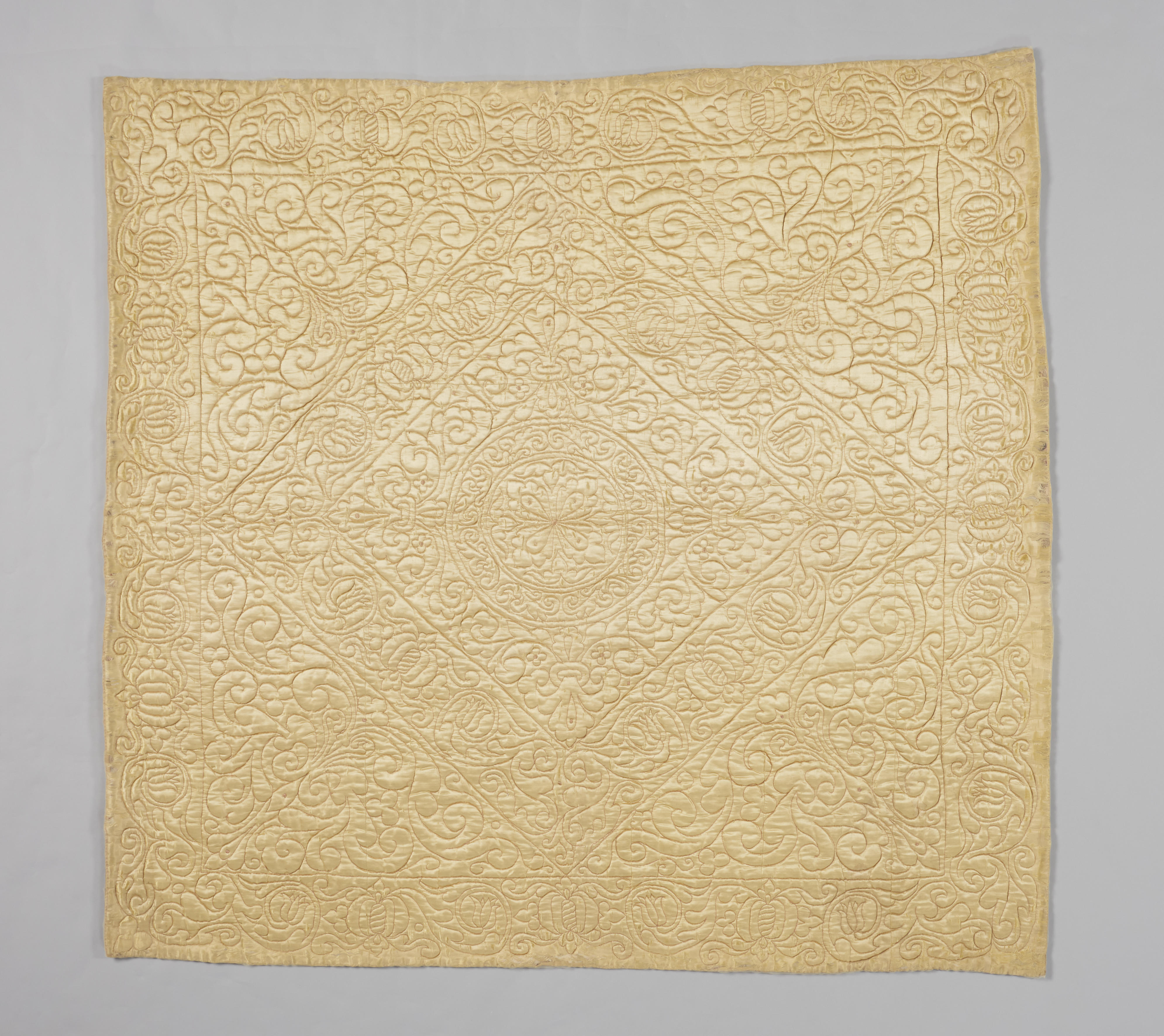 Een doorgestikte deken met een bovenzijde van effen gele zijde-satijn. Het patroon van het doorstikwerk is symmetrisch en met lichtbruine borduurzijde met steelsteken gemaakt. Tot nu toe is dit de enige bekende deken die op deze wijze is gemaakt. In het midden is een cirkel van circa 42 centimeter met een motief geplaatst in een ...