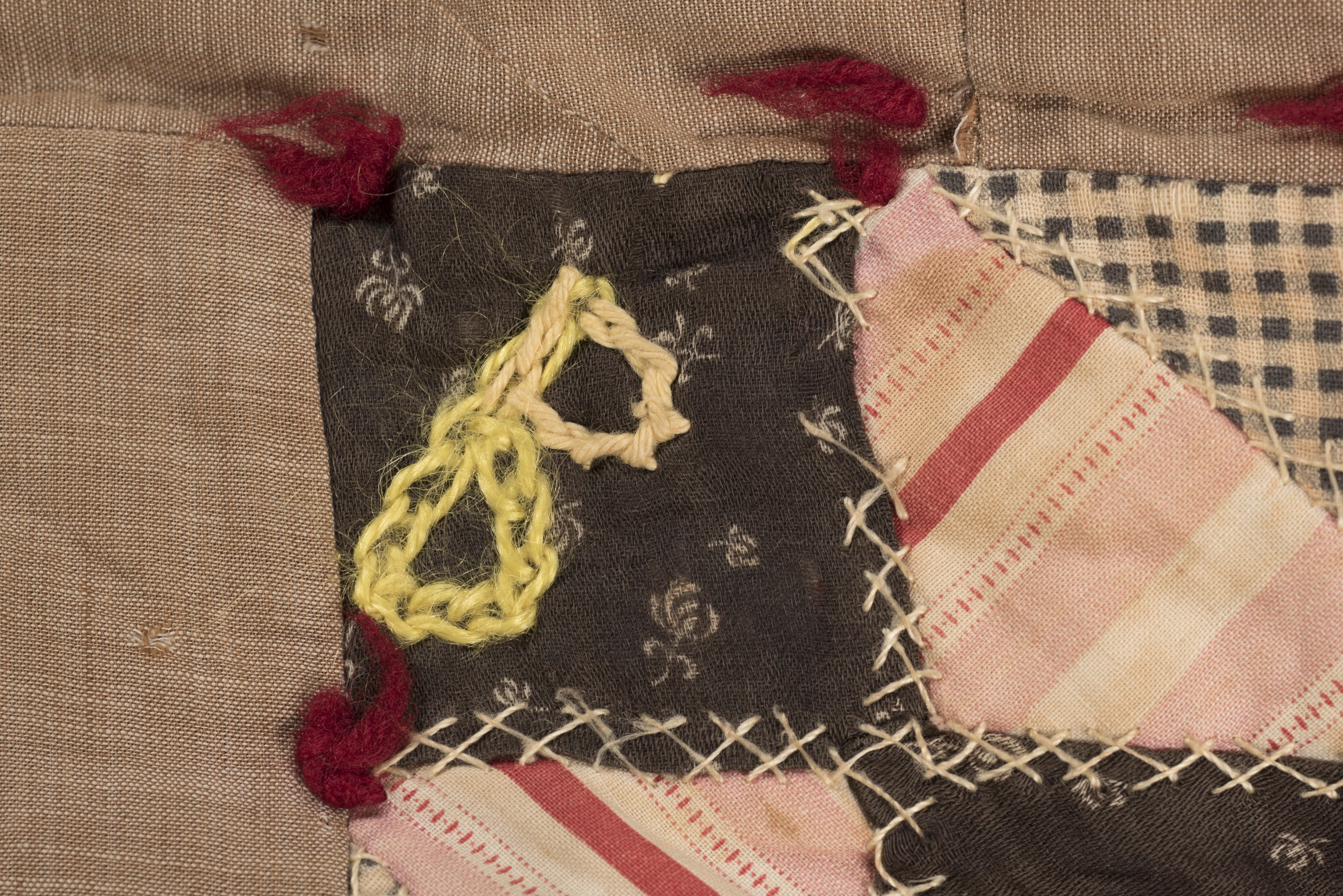 Een lappendeken die is samengesteld uit diverse gestreepte, effen en bedrukte katoenen lapjes in driehoeken en vierkanten, alle in pasteltinten. De lapjes zijn in een symmetrisch patroon met beige perlé garen aan elkaar genaaid met een flanelsteek. Rondom heeft de deken een rand van beige katoen van 6 centimeter breedte. De tussenvulling is katoenpluksel. De ...