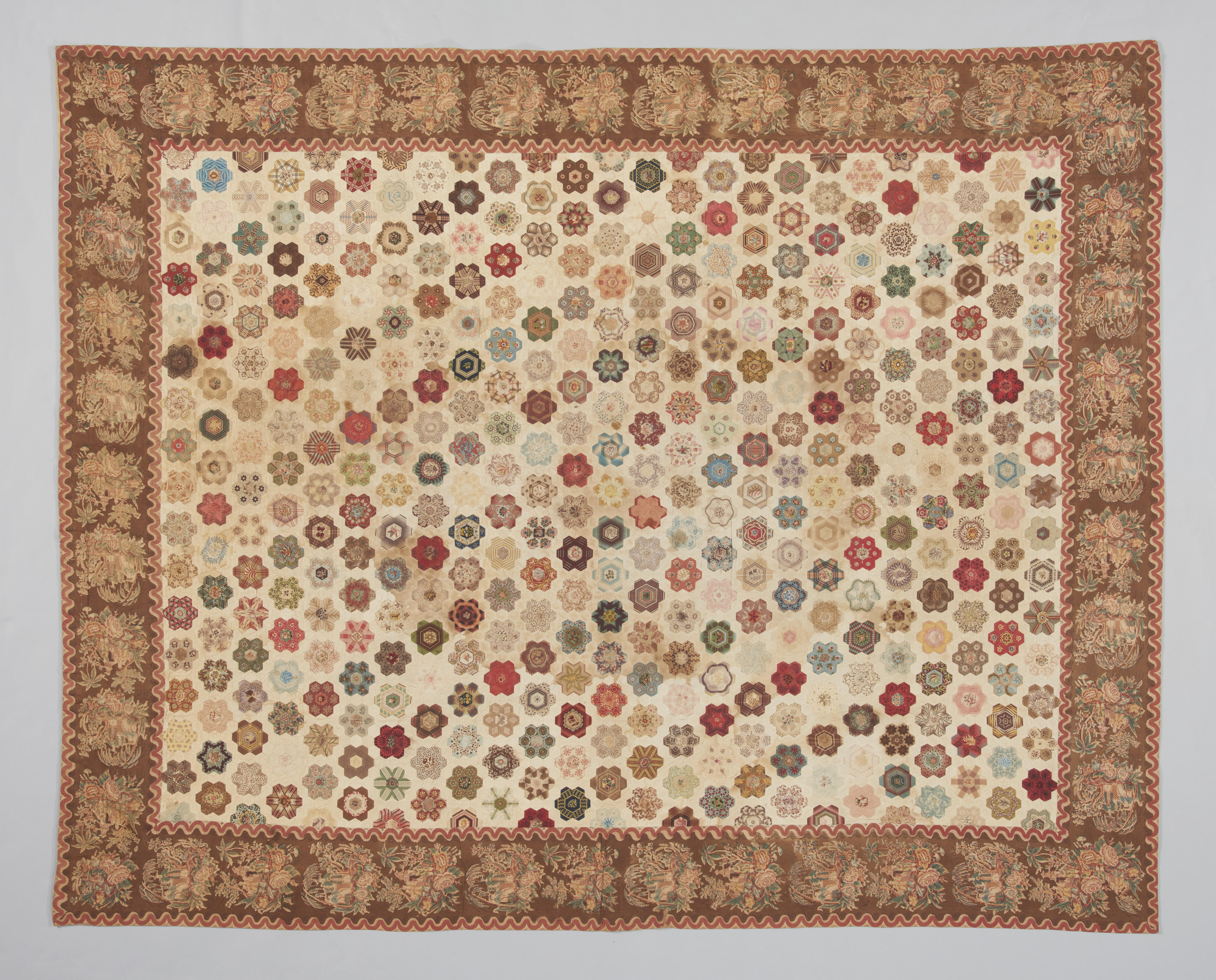 Een lappendeken die is samengesteld uit rozetten van zeshoekjes, die op een fond van witte katoen zijn geplaatst. Er zijn zeer veel verschillende bedrukte katoenen stoffen gebruikt. Deze zijn heel zorgvuldig gekozen en aan elkaar genaaid. De deken is rondom afgezet met een 20 centimeter brede rand van bedrukte katoen met een chinoiserie-achtig patroon, met ...
