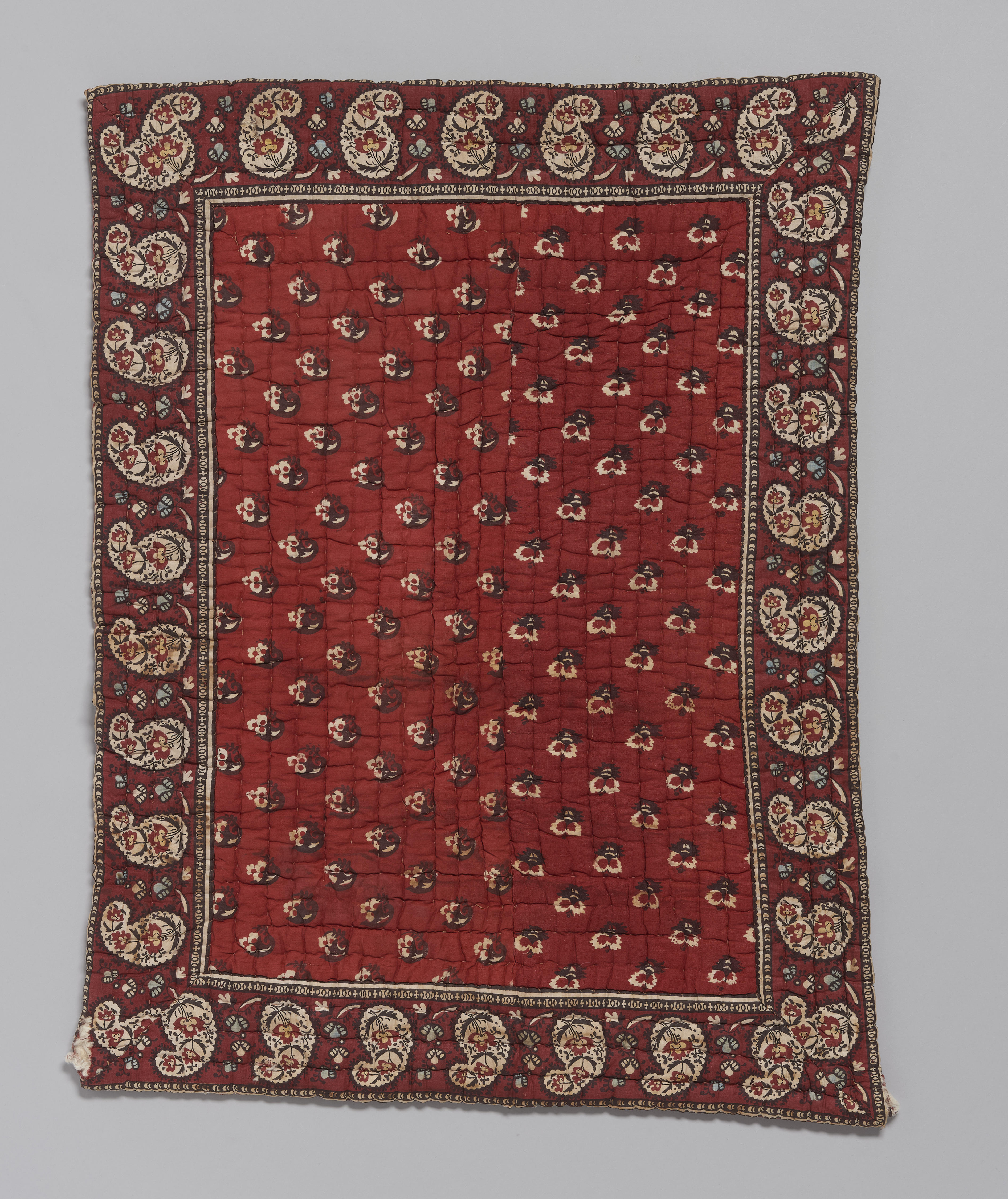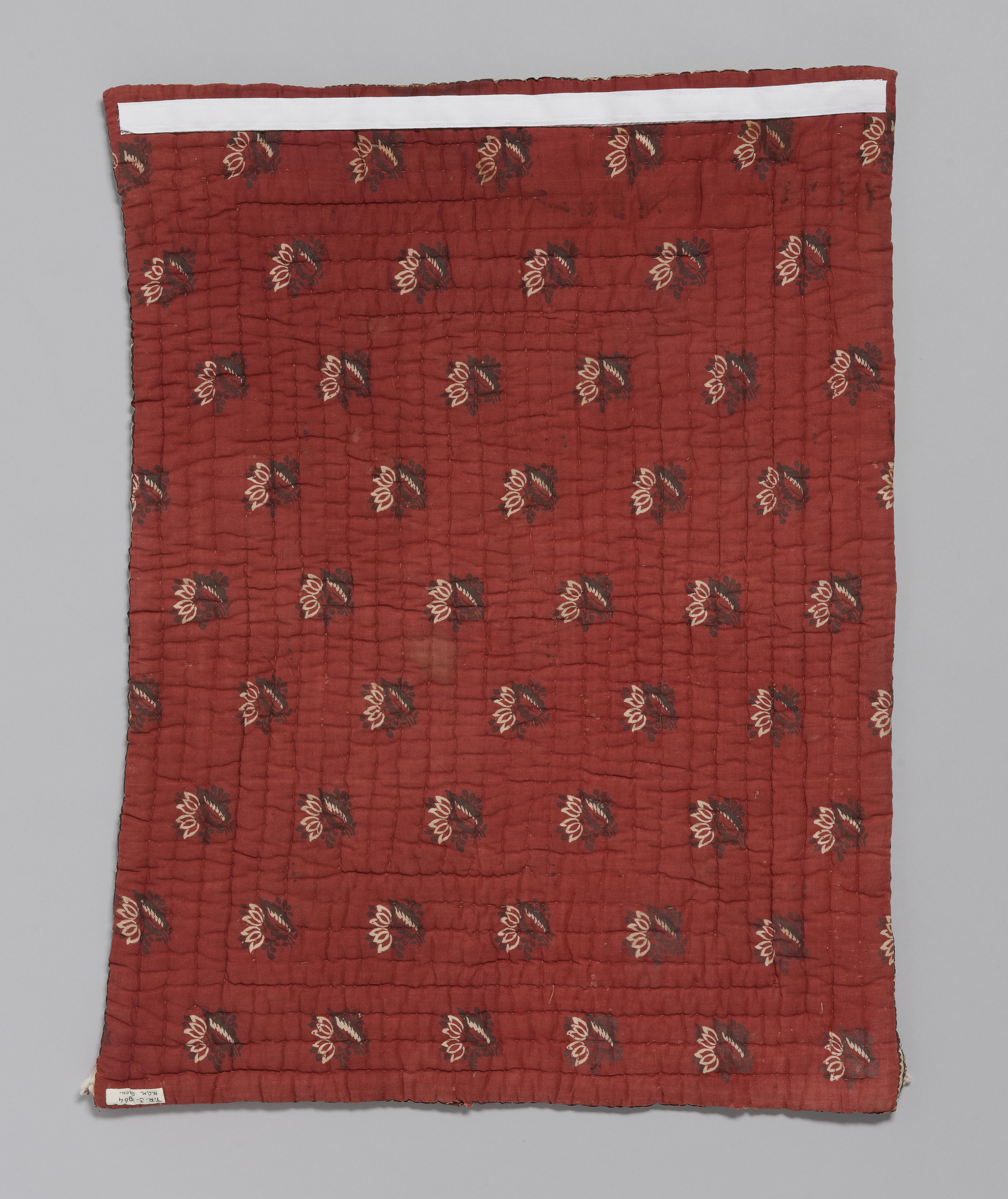 Een in Groningen gebruikt dekentje dat een bovenzijde heeft van bedrukte katoen: witblauwe bloemmotiefjes op een bruinrood fond. Rondom is een 11 centimeter brede bedrukte rand met palmetmotieven en klein roodgele bloemetjes. De tussenvulling is katoenpluksel. De achterzijde is eveneens een bedrukte katoen met bruin-witte bloemmotieven op een rood fond. Het dekentje is rondom rechthoekig ...