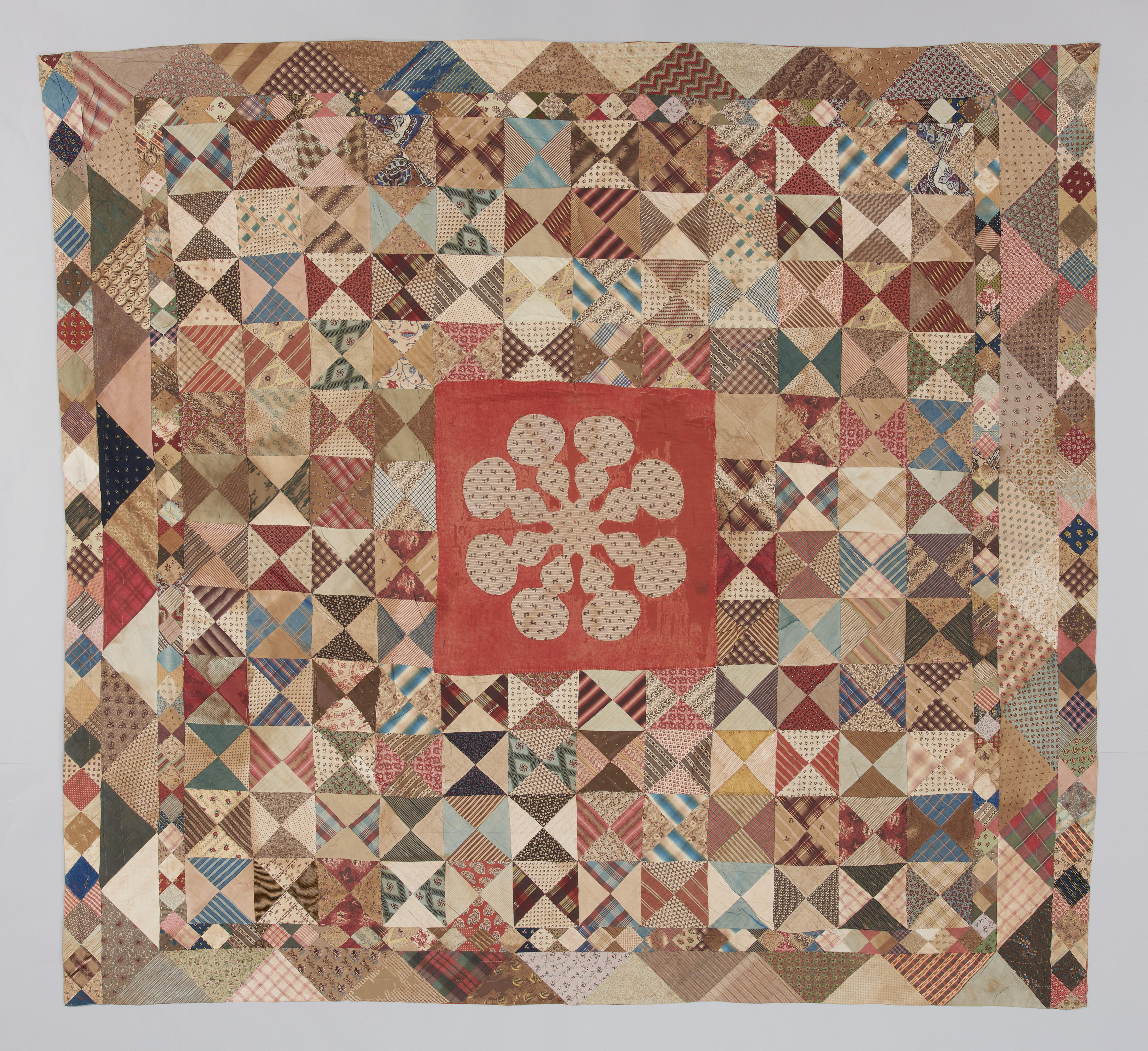 Een lappendeken waarvan de bovenzijde is samengesteld uit diverse maten driehoeken en vierkanten van bedrukte en effen katoen. In het midden zit een grote rechthoek van effen rode katoen van 62 bij 66 centimeter, met een applicatie van een achtbladig motief van een bedrukte katoen. De rest van het middenveld bestaat uit driehoeken die tot ...