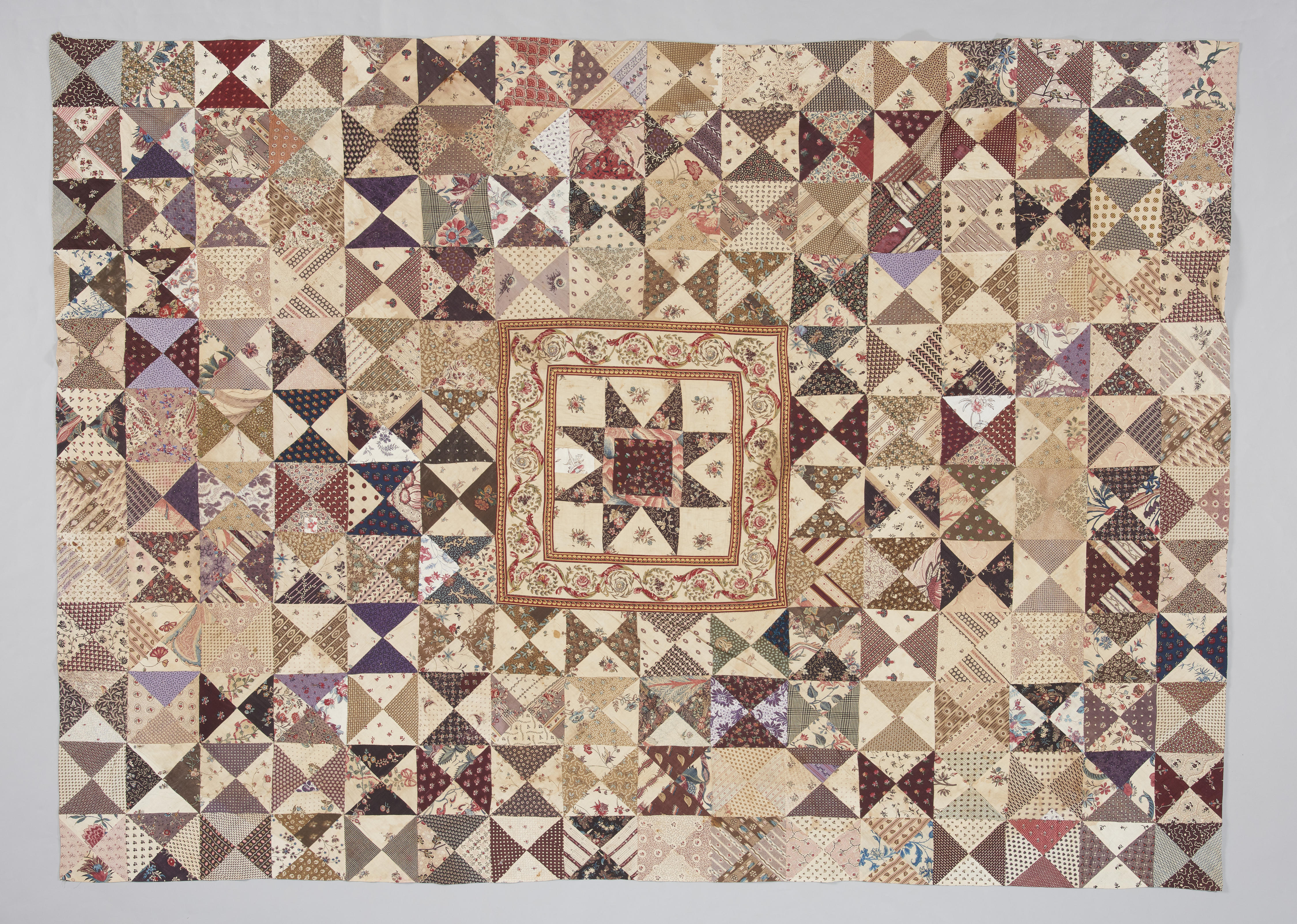 Een lappendeken bestaande uit driehoeken van sits en bedrukte katoen, die in afwisselend donkere en lichte tinten aan elkaar genaaid zijn. In het midden zit een groot vierkant van 63 bij 63 centimeter, met een achtpuntige ster. Om dit vierkant is een bedrukte gebloemde rand van 13 centimeter breed aangebracht. De deken heeft geen voering ...
